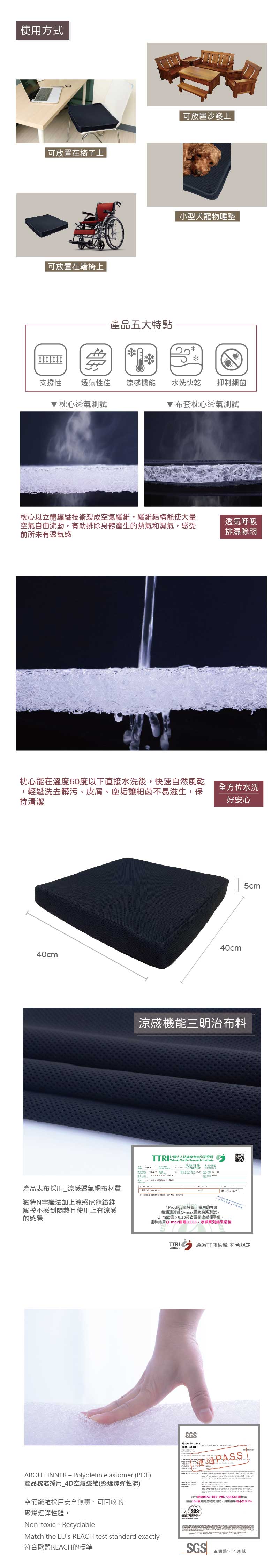 ▲嚴選透氣網布,散熱質感佳▲枕芯可直接用水沖洗,減少髒汙藏垢▲透氣性良好,久坐不悶熱▲枕芯超細纖維均衡分散身體壓力▲布套可手洗、機洗方便清理,並可隔布熨燙【尺寸/重量】40*40*5cm(±1cm)/690g(±10g)【材質】透氣網布100%枕芯─聚烯烴彈性體【注意事項】① 產品顏色因每台電腦螢幕的不同,請依實際顏色為主② 正常使用情況下布套建議定期清洗或擦拭,並且深淺色分開來洗滌③ 請避免潮濕 / 浸水 / 火源 / 利刃 / 高溫 / 日曬④ 請勿堆壓重物 / 避免不當拉扯或擠壓 / 避免沾染化學藥劑或揮發性溶劑⑤ 枕芯正常使用下無須清洗,若有飲料等液體不慎流入可以清水沖洗後自然風乾即可,勿置於陽光下曝曬以免氧化影響使用壽命