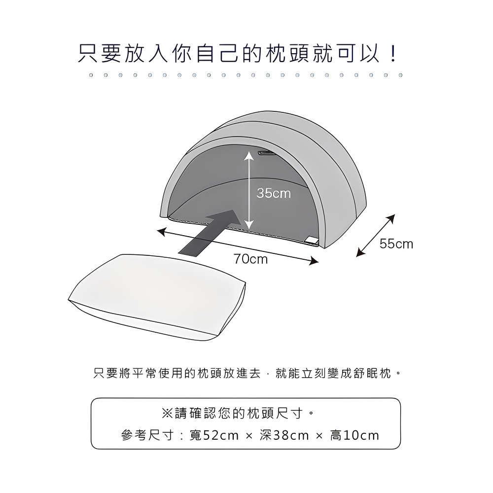 適用枕頭尺寸建議: 約 寬 52 × 深 38 × 高 10 cm 左右