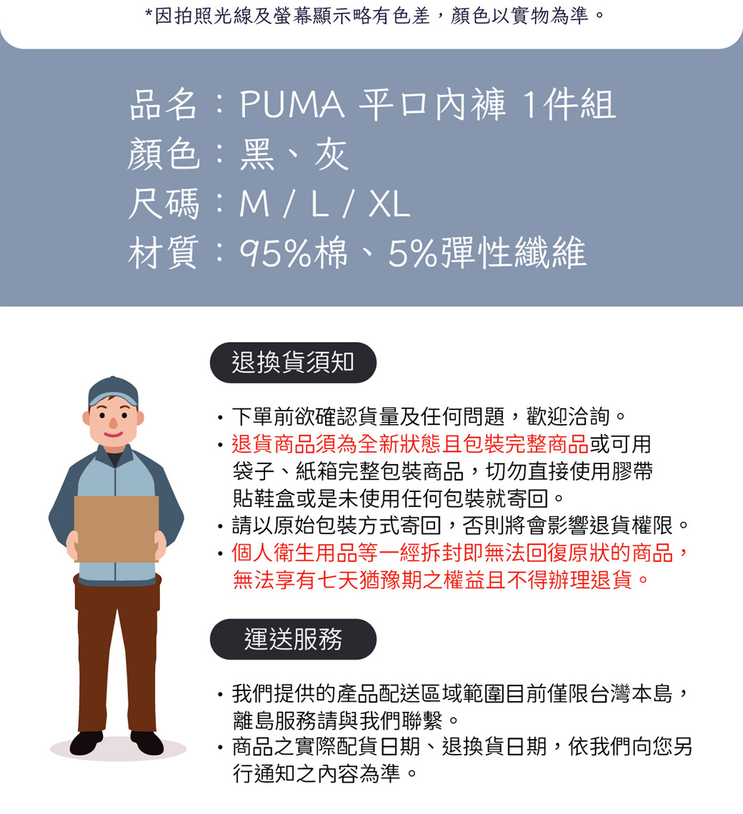 產品描述:PUMA 平口內褲 1件組 701219004 黑/灰特色:LOGO腰帶,高彈不緊勒。修身剪裁,呈現完美體格。防捲邊設計,自由活動,不易翹邊和變形。彈力貼合、持久耐穿,柔軟棉材質。雙層內襠,吸濕排汗、透氣抗菌。材質: 95%棉 ,5%彈性纖維尺碼: M / L / XL【注意事項】1.提供15天鑑賞期之權益2.退貨商品須為全新狀態且包裝完整商品,請以原始包裝方式寄回,包含完整無損之外箱、商品、包裝紙,目錄、吊牌、贈品、配件等,若原外箱已遺失,請另使用紙箱包覆於商品原廠包裝外,切勿直接於原包裝上黏貼紙張或書寫文字,來做寄送,若原盒內所有物品有損壞或遺失,須付整新費。3.個人衛生用品一經拆封即無法回復原狀的商品,無法享有7天猶豫期之權益且不得辦理退貨。