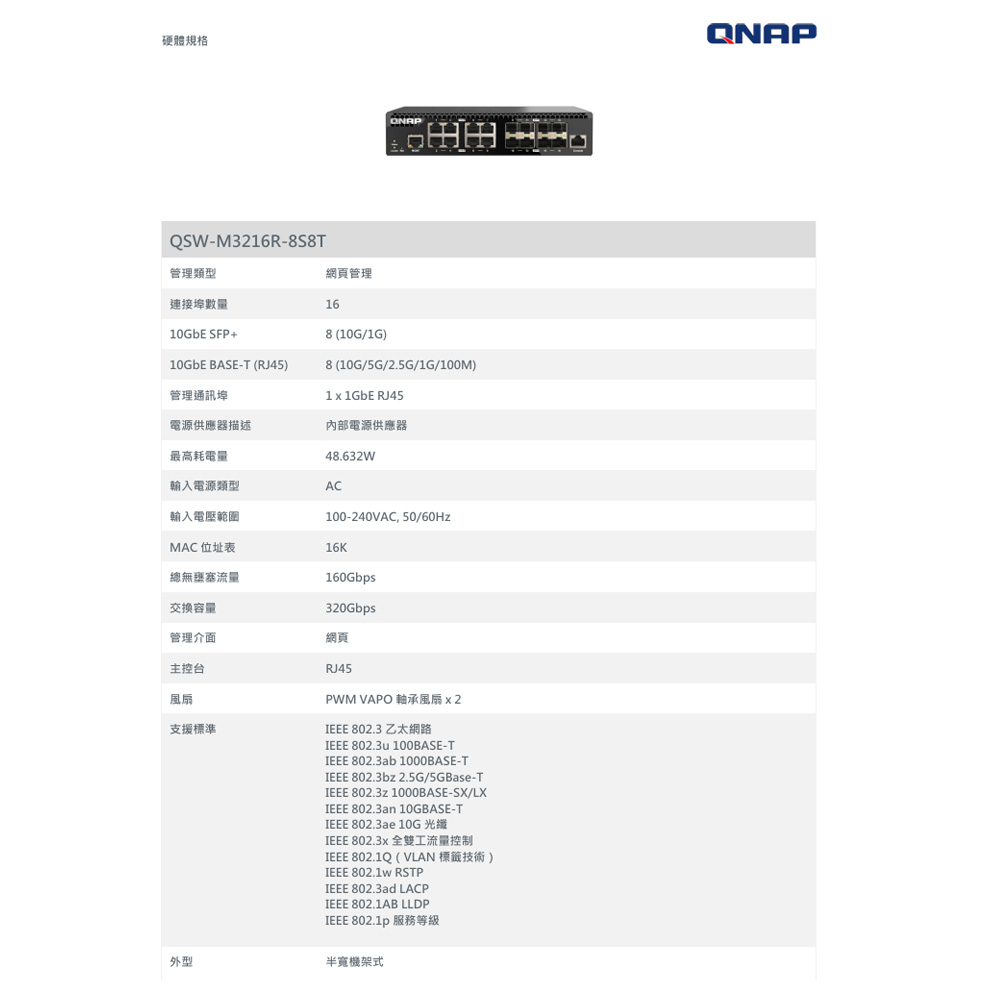 半寬機架式設計:輕巧型交換器,可在 1U 機櫃放置兩台 QSW-M3216R-8S8T,或搭配其他 QNAP 半機架式交換器,空間利用效率高。