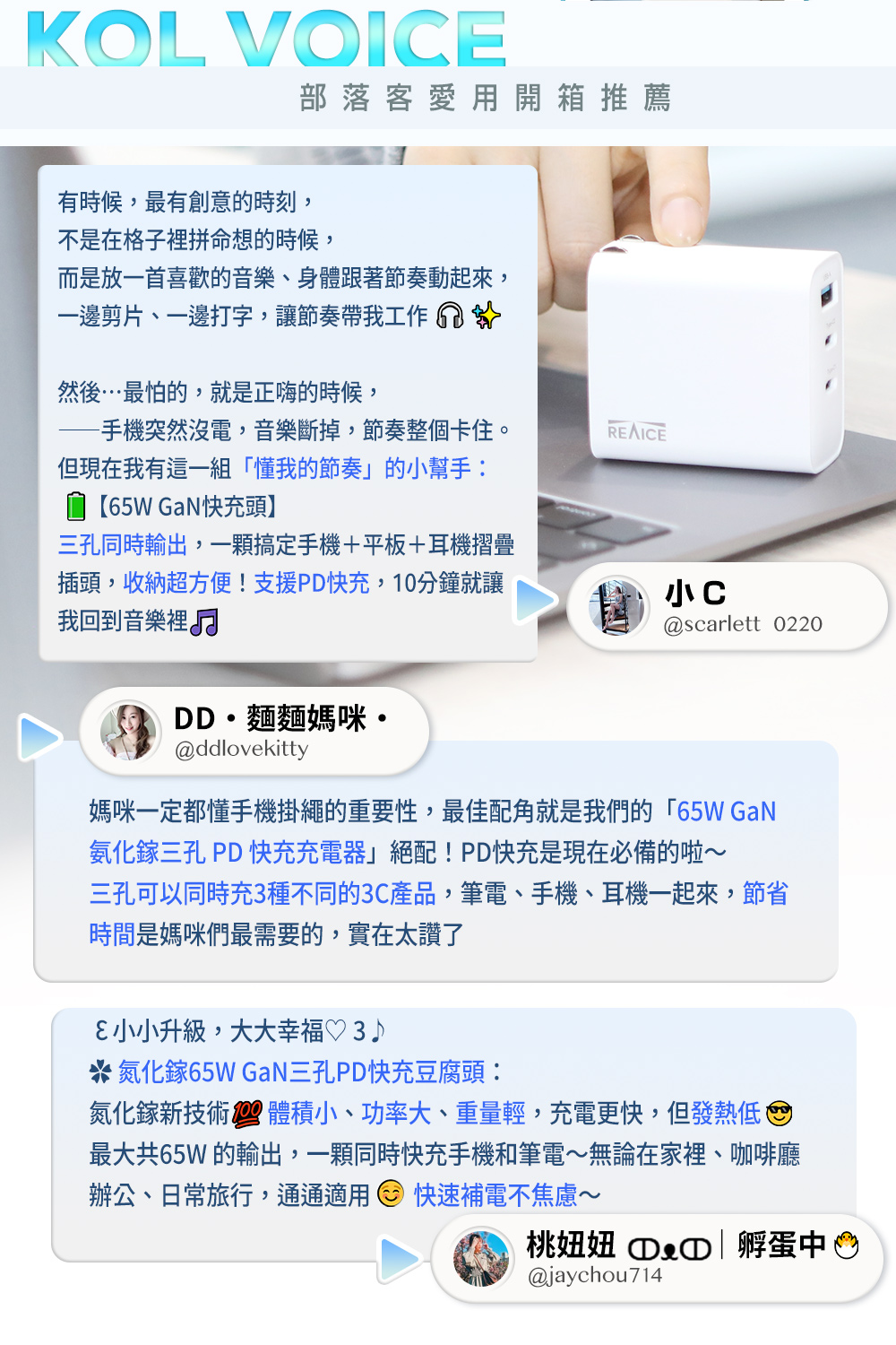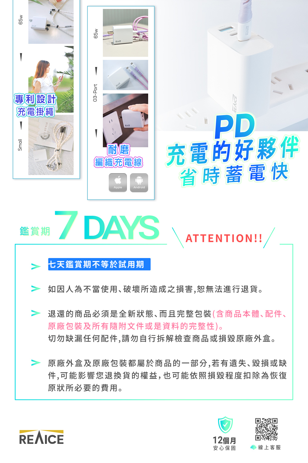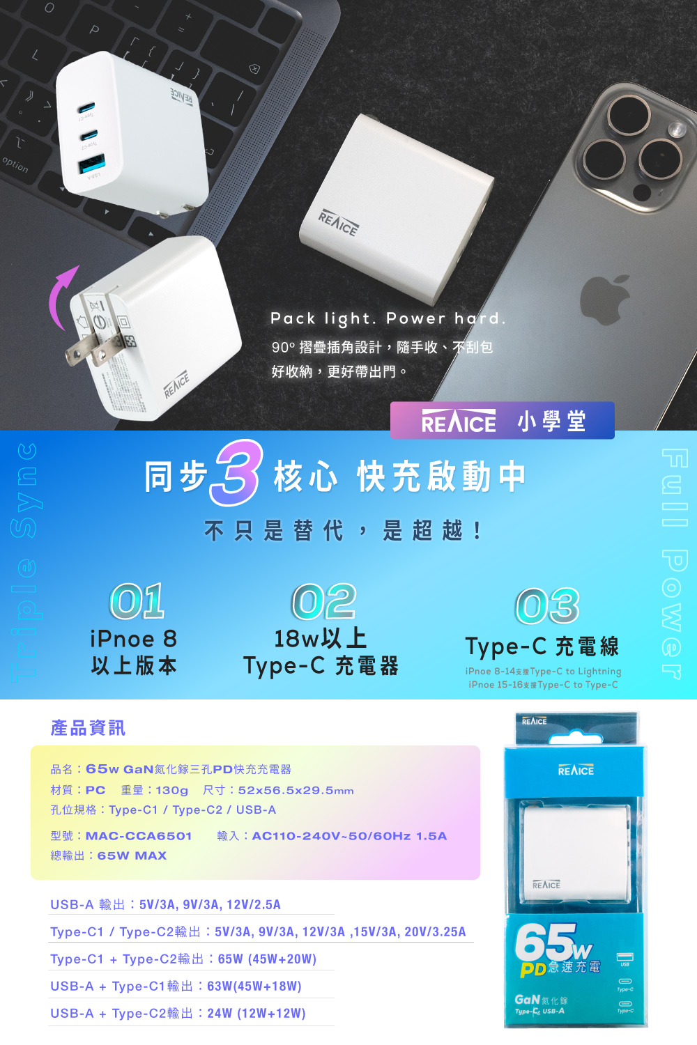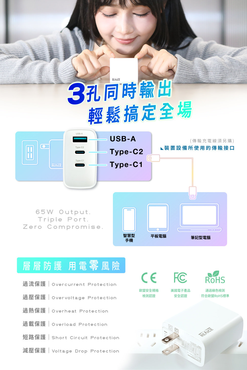 材質:PC重量:130g尺寸:52x56.5x29.5mm孔位規格:Type-C1/Type-C2/USB-A型號:MAC-CCA6501輸入:AC110-240V-50/60Hz 1.5A總輸出:65WMAXUSB-A 輸出:5V/3A,9V/3A,12V/2.5AType-C1/Type-C2輸出:5V/3A, 9V/3A, 12V/3A ,15V/3A, 20V/3.25AType-C1+Type-C2輸出:65W(45W+20W)USB-A+Type-C1輸出:63W(45W+18W)USB-A+Type-C2輸出:24W (12W+12W)顏色:象牙白