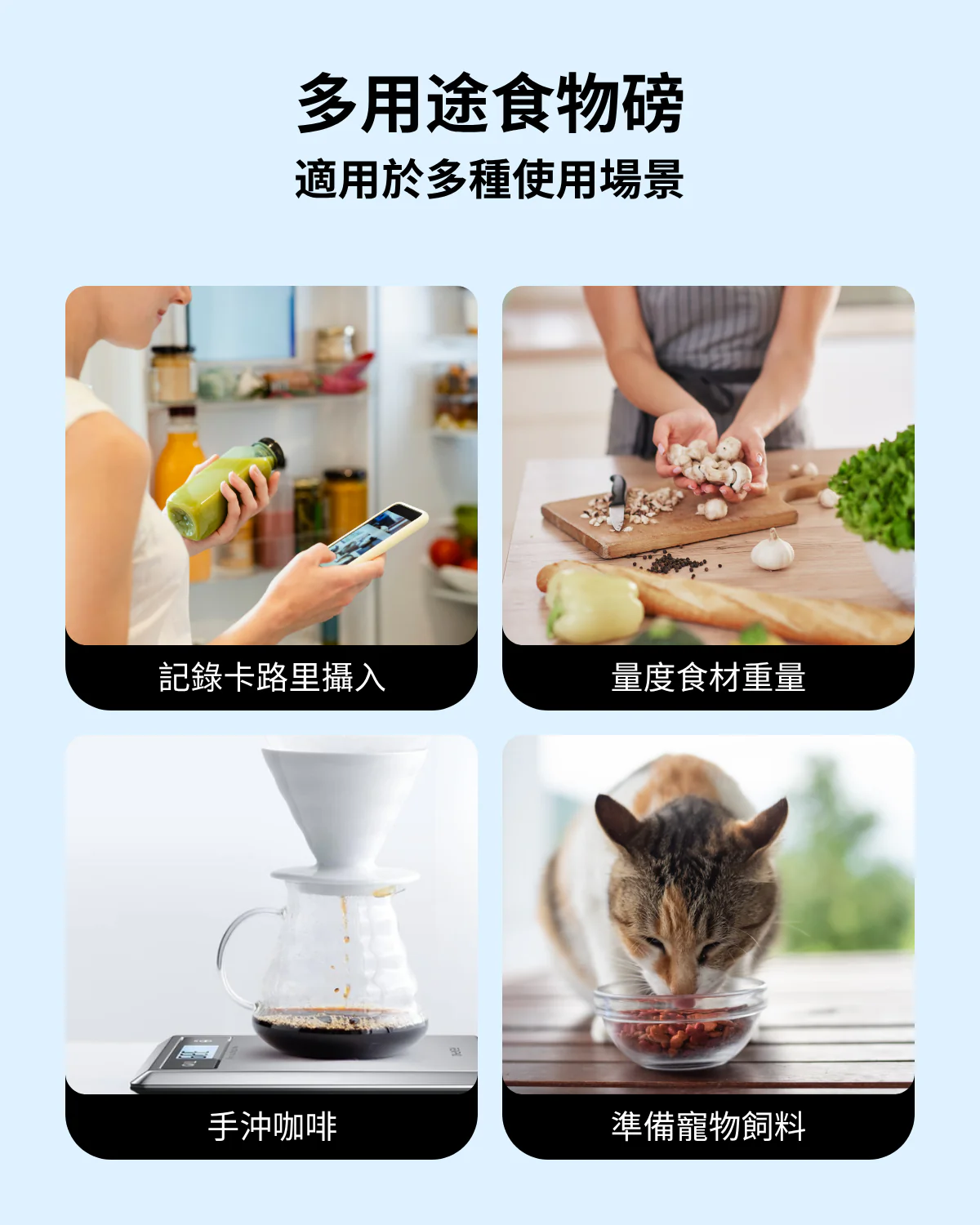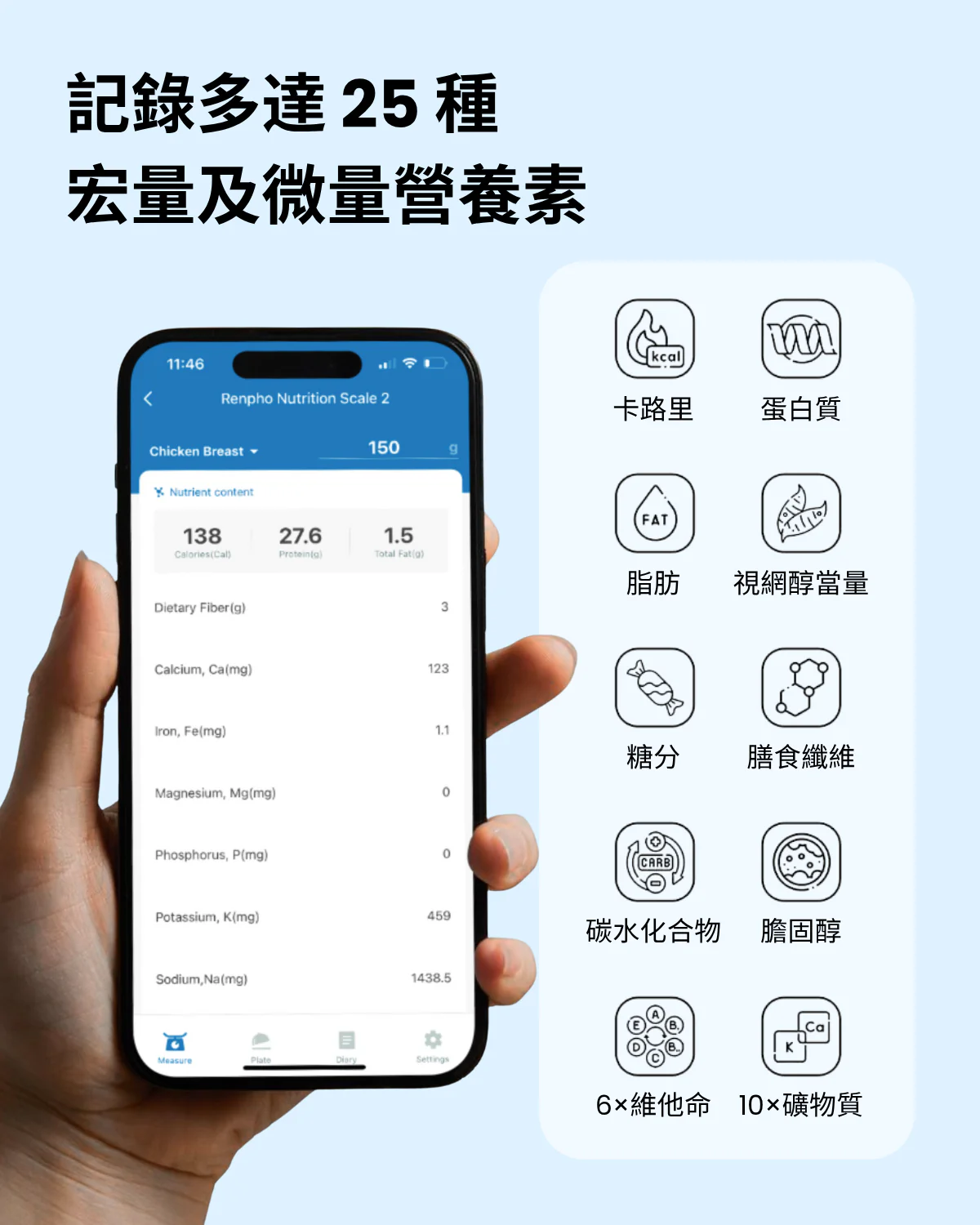 .追踪並記錄食物數據下載RENPHO Health App追踪和記錄食物數據,計算卡路里,提供詳細的營養分析,有效率訂定目標計畫與維持健康的飲食,同時還可以與 Apple Health、Samsung Health同步。.多項營養素分析,備餐量易掌握!碳水化合物、總糖分、膳食纖維、總膽固醇、鈣、鐵、鎂、磷、鉀、鈉、維生素(A、C、B1菸酸、B6、B12、D、E)、銅、錳、硒、視黃醇、等。.手沖咖啡職人好幫手使用 Renpho Health App 精密幫您計算咖啡所需的水及咖啡粉比例,當注入水時App 介面顯示咖啡粉與水目前的比例,不讓您錯過最佳黃金比例!另有計時功能,不讓時間影響了咖啡的最終風味。.精確測量以 1克 (g) / 盎司 (oz) 的測量增量準確稱量 1克 (g) 到 3000克 (g) 之間的任何物體, 由4 個靈敏的傳感器提供精確可靠的測量方式來獲得準確的重量。.液固兼顧|5 種單位顯示輕鬆將單位轉換為盎司 (oz)、磅 (lb)、盎司 (oz)、克 (g)、毫升 (ml)、液量盎司 (fl .oz),以獲得更精準的成分。您可以在食物秤一鍵切換單位或於 Renpho Health 手機 app 上變換單位。.歸零計算功能使用歸零按鈕去除容器的重量,無需更換容器即可輕鬆獲得所需食材的準確重量。.大面積鋼化玻璃大型時尚玻璃平台,兼容大部分食物容器,易於清潔和防水表面。.節省能源具有自動關閉功能以延長電池使用壽命,不必擔心再次使用時沒電可用。.產品規格- 產品型號:ES-SNG01- 容量:6.61磅 (lbs) / 3000克 (g) / 3000毫升 (ml) / 105.5 液量盎司 (fl .oz)- 單位:盎司 (oz)、磅 (lb)、盎司 (oz)、克 (g)、毫升 (ml)、液量盎司 (fl .oz)- 測量增量:0.05盎司 (oz) / 1克 (g) / 1毫升 (ml) / 0.1液量盎司 (fl .oz)- 電池規格:3*AAA (1.5V)(內未付)- 尺寸 : 19.1 x 16.7 x 2.1 cm(公分)- 重量:0.48 kg(公斤)- NCC:CCAB22LP1210T5- 製造地:中國