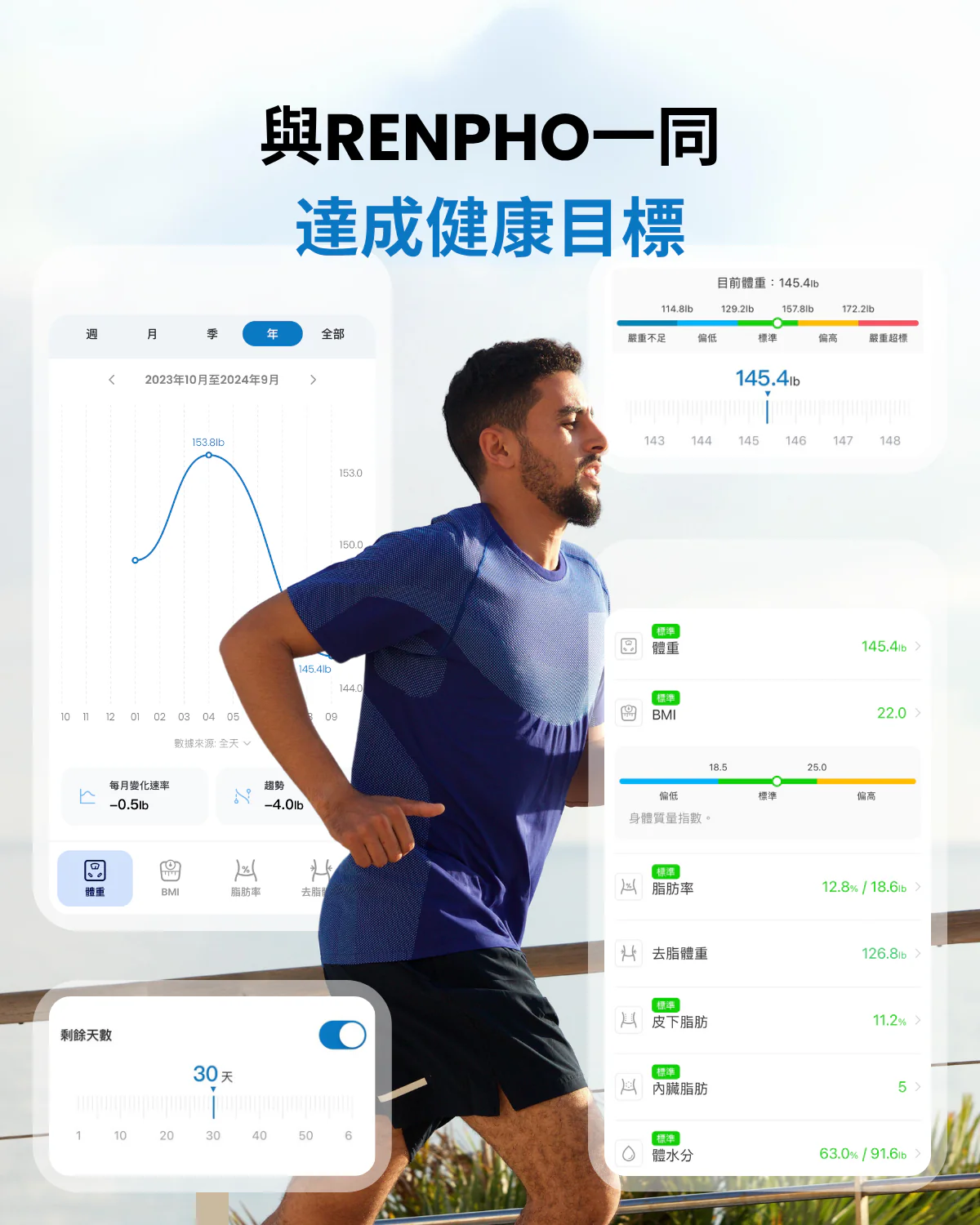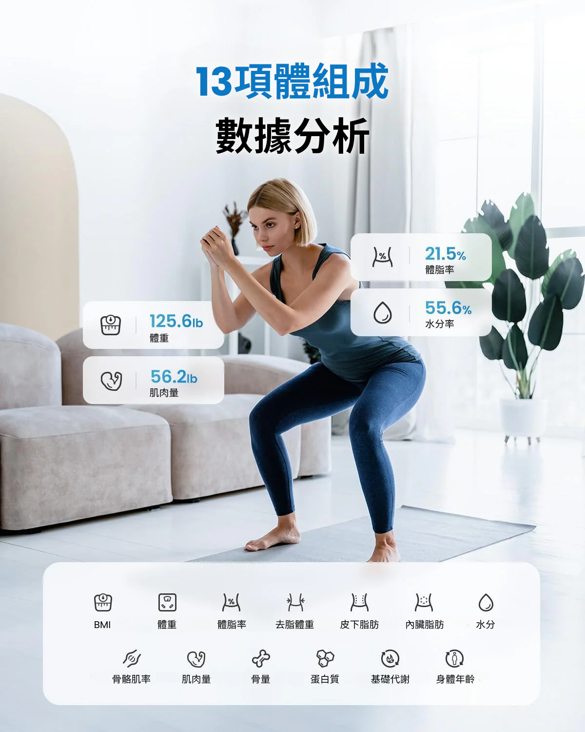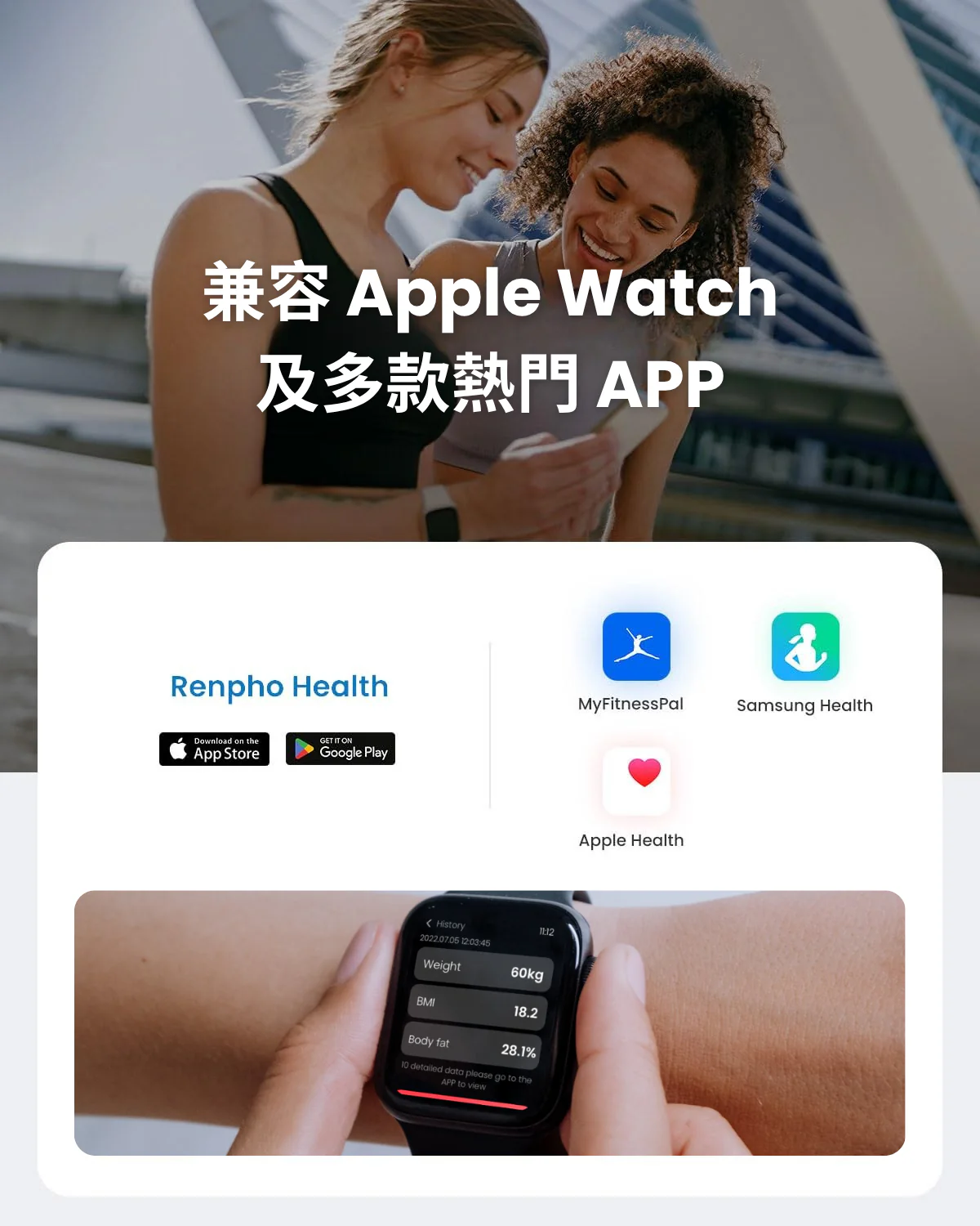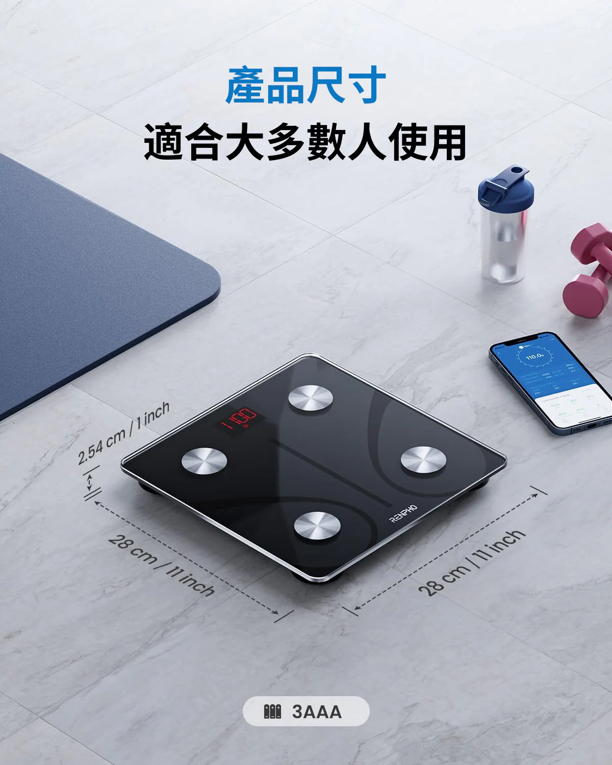 可追蹤13種身體組成數據13 項基本身體測量。體重顯示在體重秤上,其他身體成分數據包括體重、BMI、體脂百分比存儲在應用程序中。Renpho 應用程式保存歷史數據並追踪您的每日、每周和每月進度,監控個人的指標變化,以幫助激勵您實現目標。嬰兒稱重模式可記錄變化並跟踪嬰兒和寵物的重量。自動校準高精度感應器以 0.2 磅 / 0.05 公斤的增量進行測量。持添加無限用戶這款體組成分析儀可讓您和您的家人共享使用。用戶友好的應用程序在 App Store 或 Google Play 下載 Renpho 應用程序,也適用於 Apple Watch(Apple Watch Series 1 除外)。尺寸: 27.94 x 27.94 x 2.54 公分無線連接模式: 藍芽4.0電源: 3 x AAA (1.5V) 電池量秤單位: 公斤、英磅 (可從 APP進行切換)顏色: 黑最大量秤重量 : 180kg / 396lb