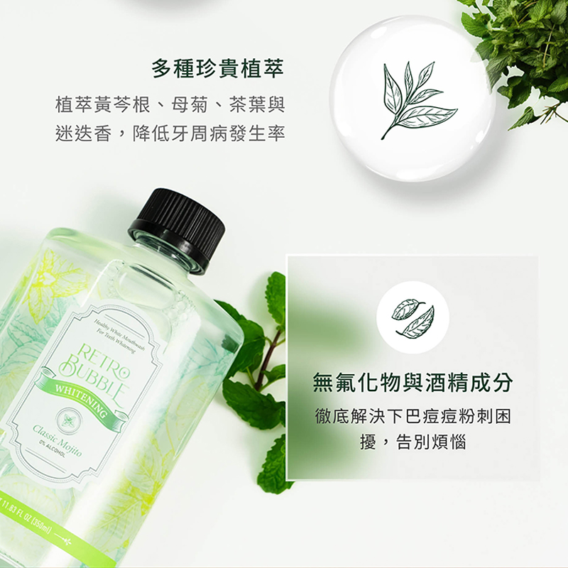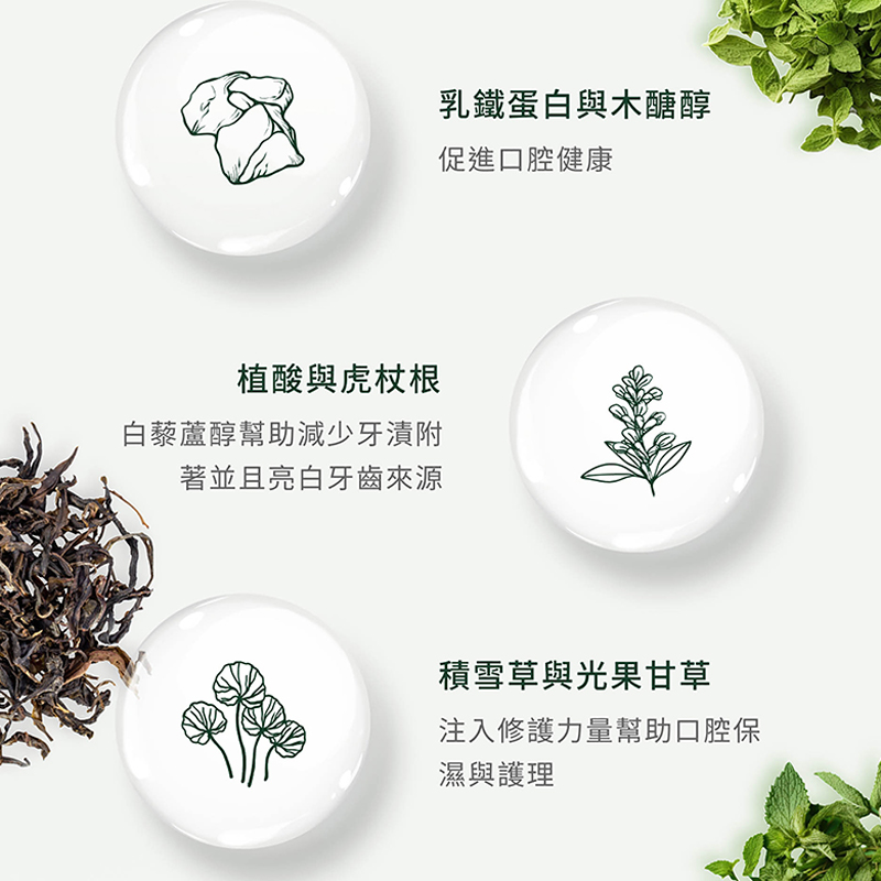 全效防護、無氟牙膏不僅能為您帶來清新口氣,還能減少牙菌斑及牙結石,保護牙周健康。其天然的抗菌功能有助於降低牙菌斑的發生率,提高牙周防護力,同時有效預防蛀牙和口腔異味。多種天然的草本配方,特別適合追求天然護理的您全面的口腔保健體驗。 「乳鐵亮白草本漱口水-MOJITO口味」為您帶來口腔健康與美白體驗。融合清新薄荷和Mojito風味,專注亮白和口腔防護,含乳鐵蛋白、木醣醇,植酸和虎杖根,清潔明亮牙齒。積雪草和光果甘草提供潤澤修護,植物精華預防牙周病。無氟化物和酒精,解決下巴痘痘粉刺問題。感受溫柔舒適口腔護理,展現自信笑容!