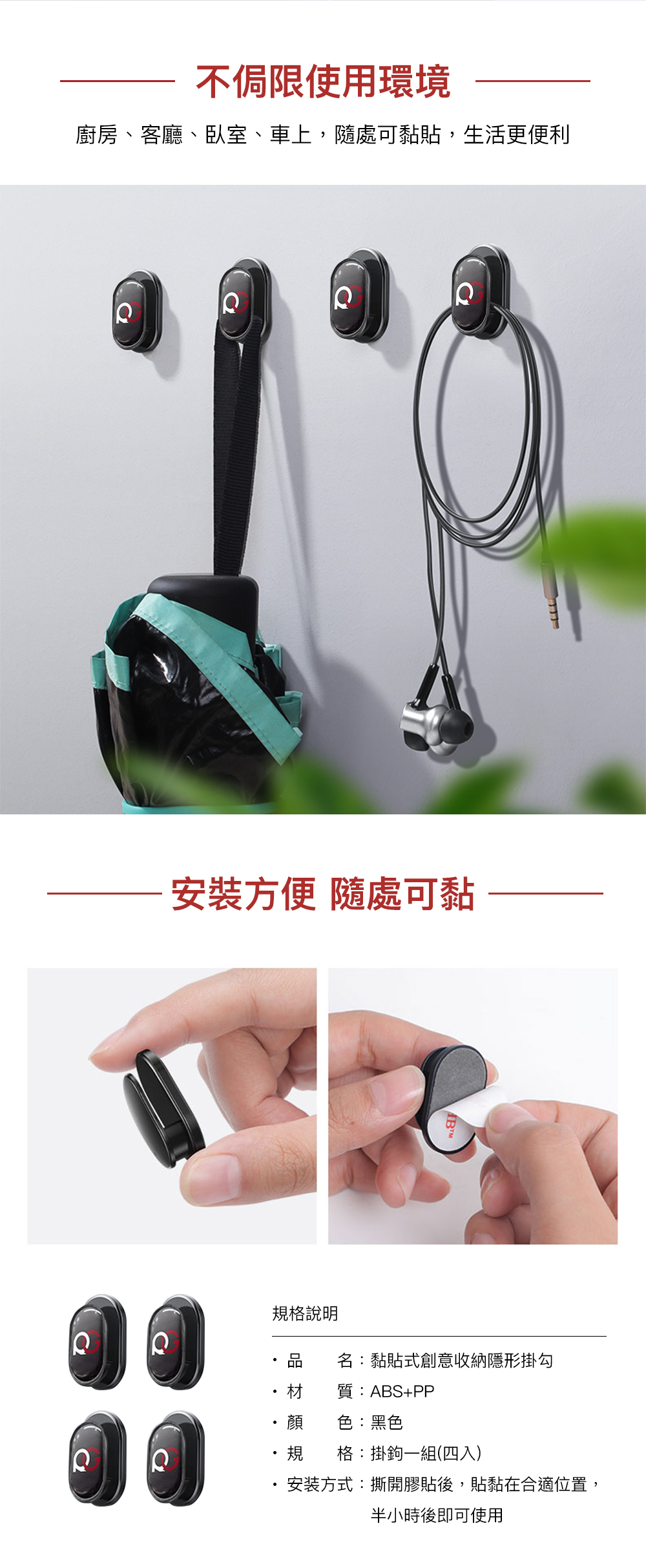 迷你、隱形掛勾,車內、居家皆可使用很牢固~‧材質:ABS+PC材質‧顏色:黑色‧規格:掛勾x4入‧產地:China‧荷重:601g~800g(1kg以下)‧安裝方式:黏貼式撕開膠貼後,貼黏在合適位置,半小時後即可使用