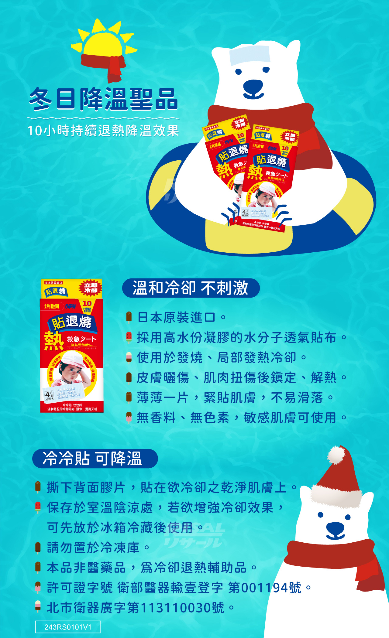 ●日本原裝進口,高科技高水份凝膠設計的水分子凝膠透氣纖維膠布,溫和冷卻肌膚。●可持續超長10小時溫和冷卻。●取代傳統冰枕,無需預先冷藏,撕下透明片即可使用,緊緊貼附肌膚,即使翻身亦不易滑落,方便又有效。●無香料、無色素,溫和不刺激皮膚,不引起過敏,冷冷貼、快快好。適合全家老少,在發燒、發熱、頭痛、牙痛、肌肉疲勞酸痛、曬傷後鎮定,均可降溫解熱,迅速促進冷卻效果,保持溫和舒適。