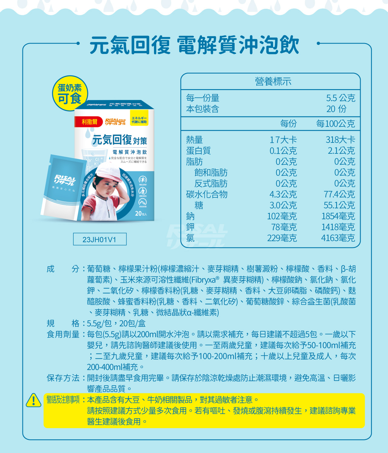 葡萄糖、檸檬果汁粉(檸檬濃縮汁、麥芽糊精、樹薯澱粉、檸檬酸、香料、β-胡蘿蔔素)、玉米來源可溶性纖維(Fibryxa® 異麥芽糊精)、檸檬酸鈉、氯化鈉、氯化鉀、二氧化矽、檸檬香料粉(乳糖、麥芽糊精、香料、大豆卵磷脂、磷酸鈣)、麩醯胺酸、蜂蜜香料粉(乳糖、香料、二氧化矽)、葡萄糖酸鋅、綜合益生菌(乳酸菌、麥芽糊精、乳糖、微結晶狀α-纖維素)