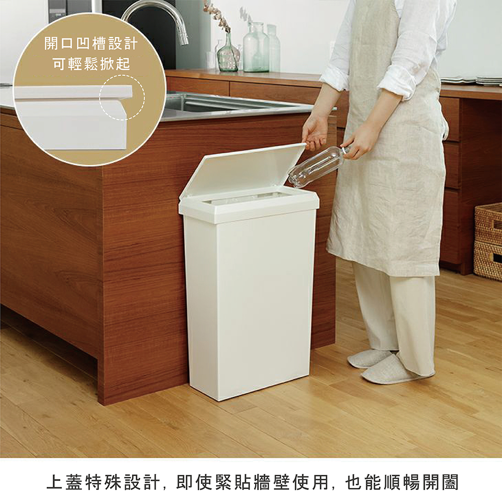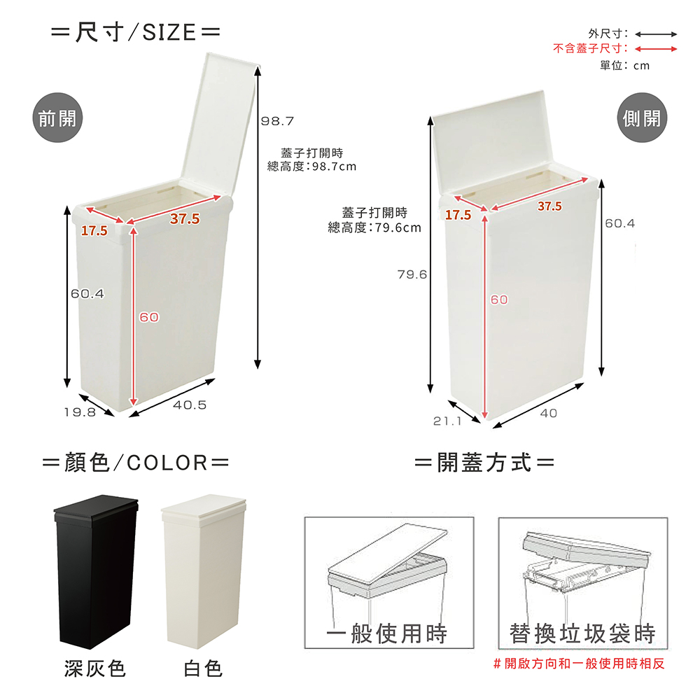 【商品規格】尺寸:窄型:198mm 寬 x 405mm 深 x 604mm 高 (mm) 蓋子打開時的高度:987mm ※蓋子從短邊打開 寬型:400mm 寬 x 211mm 深 x 604mm 高 (mm) 蓋子打開時的高度:796mm ※蓋子從長邊打開重量:1.974kg容量:40L材料:PP(聚丙烯)原產地:日本