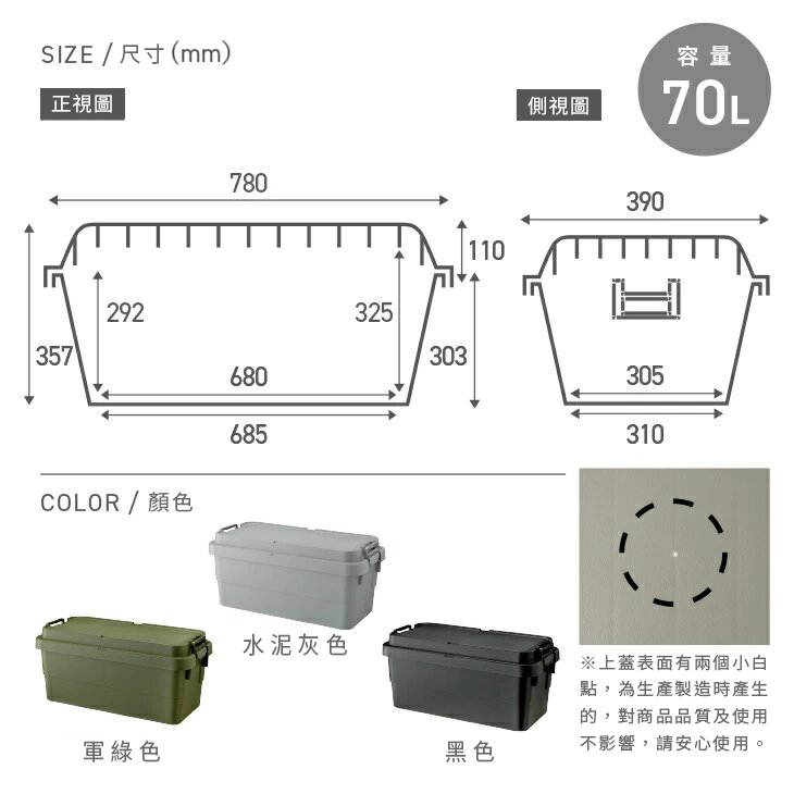 內部特殊的蜂巢式設計 造就出不輕易損壞的收納空間耐重可達100公斤重,可坐可站立,在戶外也可直接當桌子使用黑色、軍綠色、水泥灰色都非常適合於戶外活動外觀尺寸:寬78 x 長39 x 高35.7(公分)內部尺寸:寬68 x 長30.5 x 高29.2(公分)材質:PP(聚丙烯)製品重量:3885g上部承受重量:約100kg容量:70公升 製造國:日本