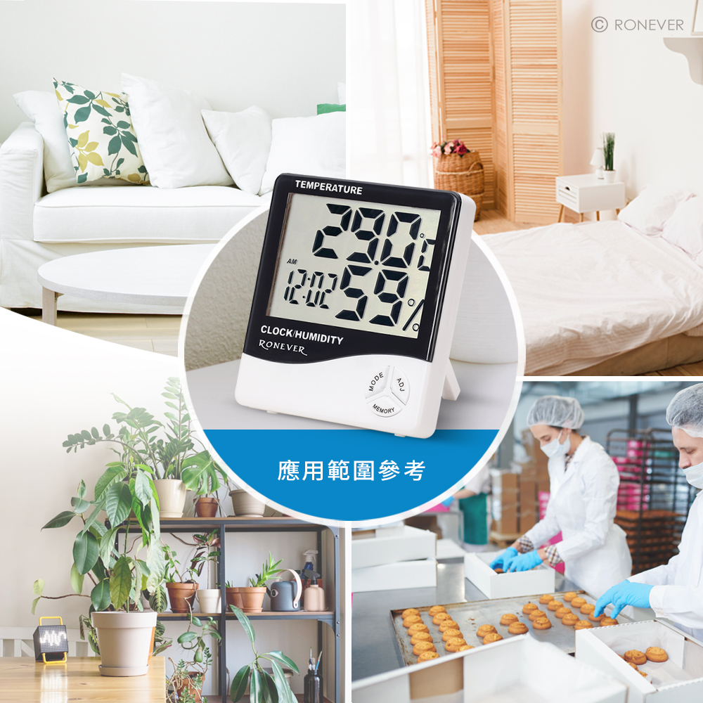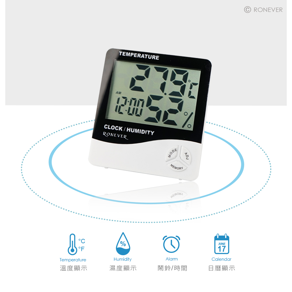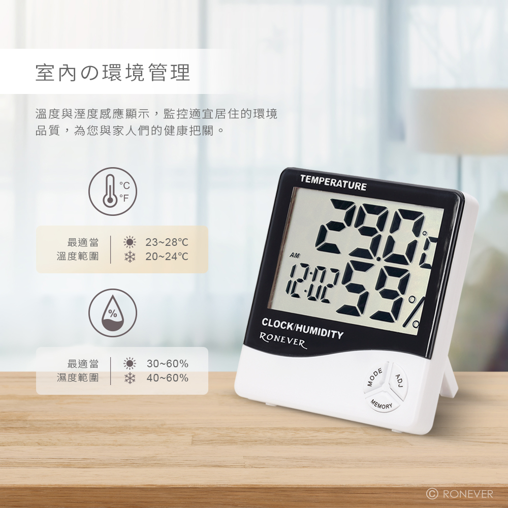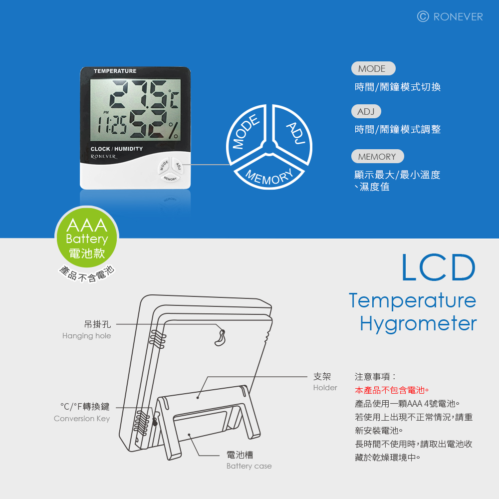 • 大字符液晶顯示器。• 日曆顯示功能,12/24小時制顯示。• 每日鬧鐘功能,時間/鬧鐘模式切換。• 顯示最大/最小溫度、濕度值。• 產品使用一顆AAA 4號電池。額定電壓︰DC 1.5V溫度測量範圍︰-10℃~+50℃(-14℉~+122℉)溫度測量精準度︰±1℃(1.8℉)溫度分辨率︰±1℃(0.2℉)產品尺寸︰93x102x23mm使用電池︰AAA(四號)電池x1(產品不含電池)濕度測量範圍︰10%~99%RH濕度測量精準度︰±5%RH濕度分辨率︰1%產品材質︰ABS塑膠、電子零件重量︰91g包裝內容︰溫濕度顯示器x1、說明書x1