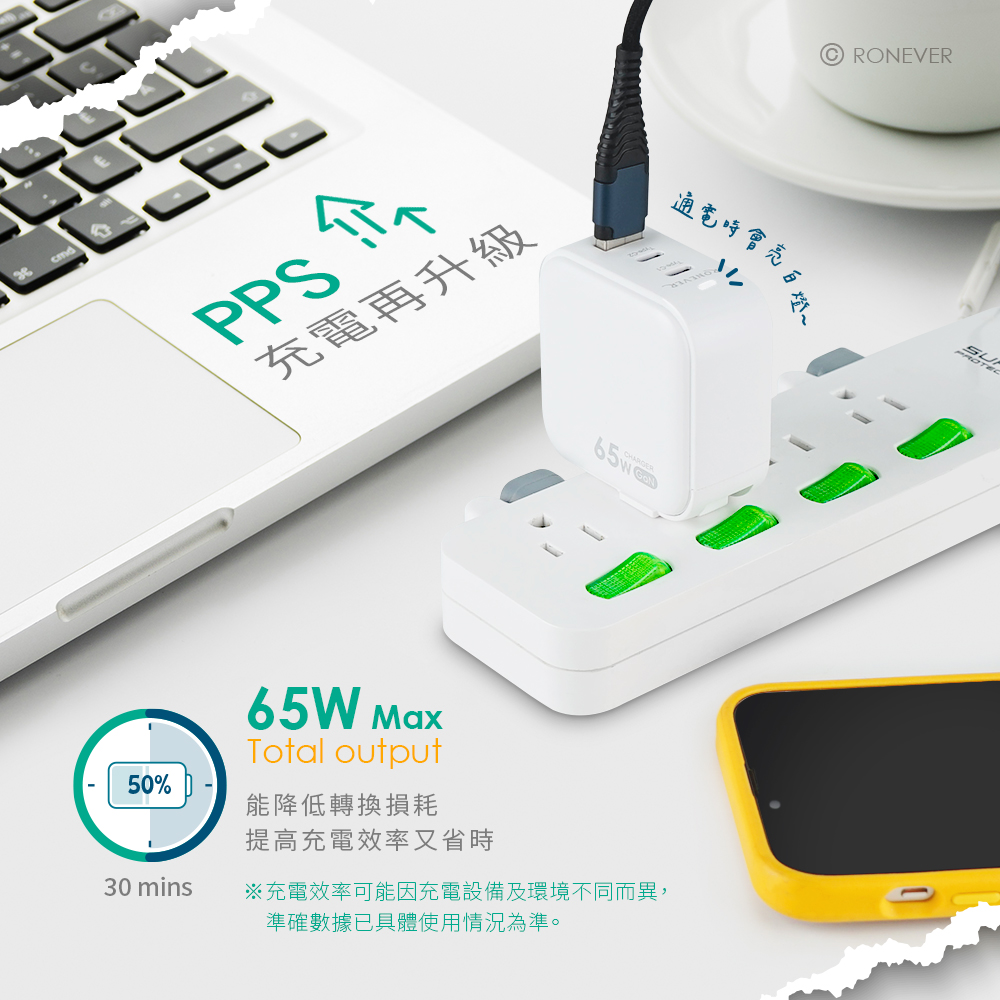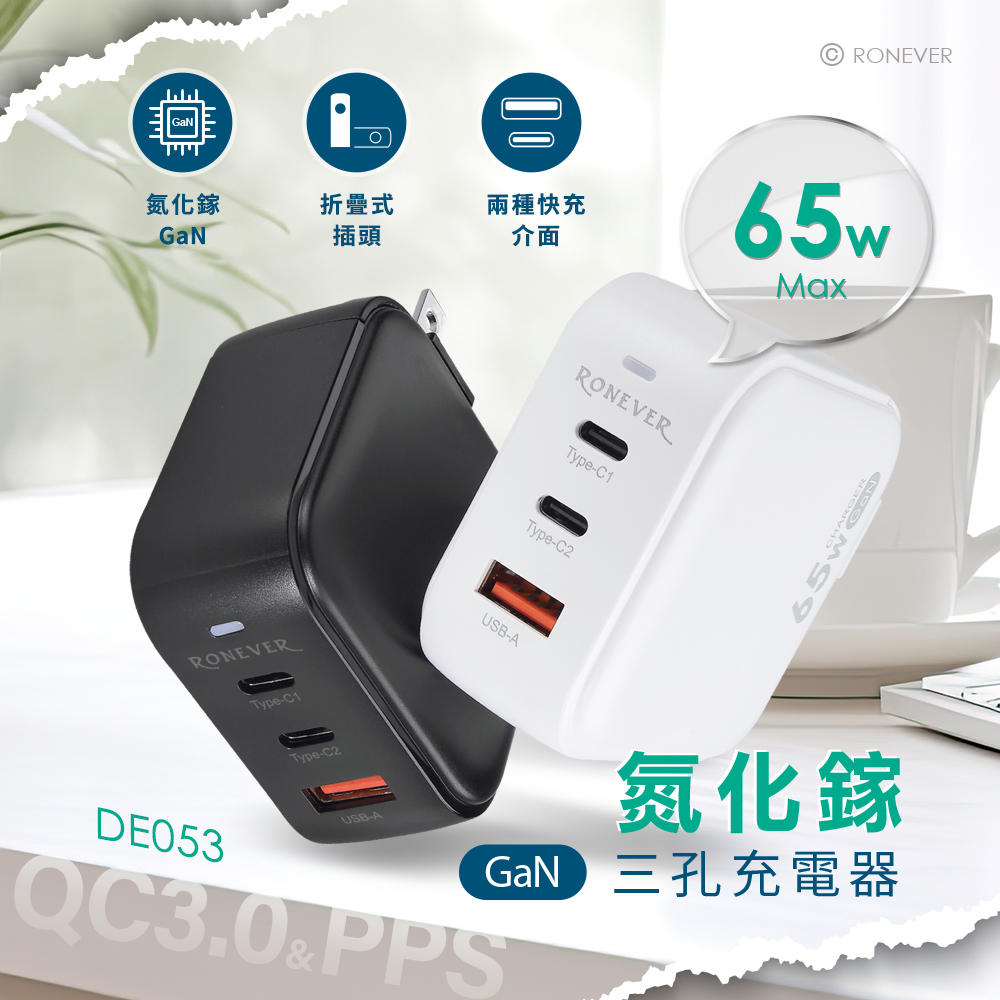 • GaN(氮化鎵)新半導體材料,具有強力導熱效率、耐高溫。• PPS充電再升級,能降低轉換損耗,提高充電效率又省時。• 65W大功率三口輸出,智慧晶片保護,快充不傷機。• 全面兼容,同時滿足多設備需求,輕量小巧,也不占插座空間。• 摺疊插頭設計,輕鬆收納更方便。• 指示燈設計,通電時亮白燈,狀態一目瞭然。• 具短路、過壓、電流、過熱等保護設計。• 通過國家BSMI安規合格認證,採用ABS防火材料、安全無慮。輸入電壓:100-240V~50/60Hz 1.5A輸出電壓:Type-C1:DC 5V/3A, 9V/3A, 12V/3A, 15V/3A, 20V/3.25AType-C1(PPS):DC 3.3-16V/3.25A, 3.3-21V/3AType-C2:DC 5V/3A, 9V/3A, 12V/3A, 15V/3A, 20V/3.25AType-C2(PPS):DC 3.3-9V/3A, 3.3-20V/3AUSB-A:DC 5V/3A, 9V/3A, 12V/3AType-C1+Type-C2:45W+20WType-C1+USB-A:45W+18WType-C2+USB-A:DC 5V/3AType-C1+Type-C2+USB-A:45W+15W最大總輸出:65W尺寸:62 x 62 x 31 mm重量:約135g材質:PC塑膠、ABS塑膠、電子零件包裝內容︰充電器x1、說明書x1