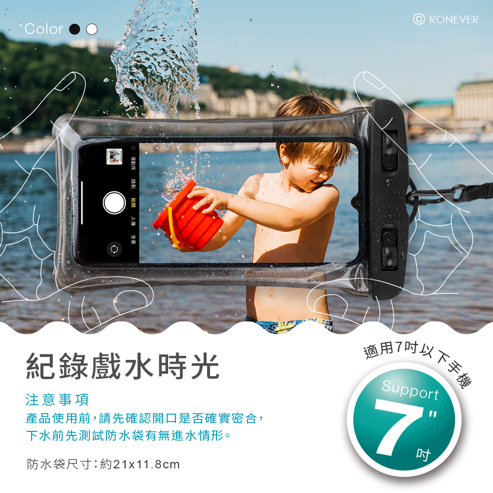 • 雙氣囊全面防護,IPX8強化防水結構,安全更升級。• 適用7吋以下手機使用,高清透視TPU材質,觸控靈敏。• 快扣結構,一鍵鎖閉不易鬆開,簡單拆卸。• 真空氣囊層,漂浮防撞設計,減振效果大提升。• 防水袋適合外出戲水、溯溪、划船...等戶外親水活動使用。• 內含頸掛繩,尼龍材質牢固耐磨。適用手機尺寸:7吋材質:PVC塑膠、TPU塑料、尼龍頸掛繩長度:約44cm尺寸:約21x11.8cm重量:約33g包裝內容:防水袋x1、掛繩x1