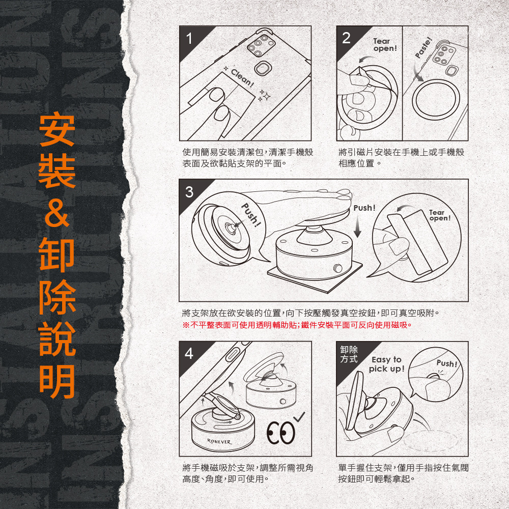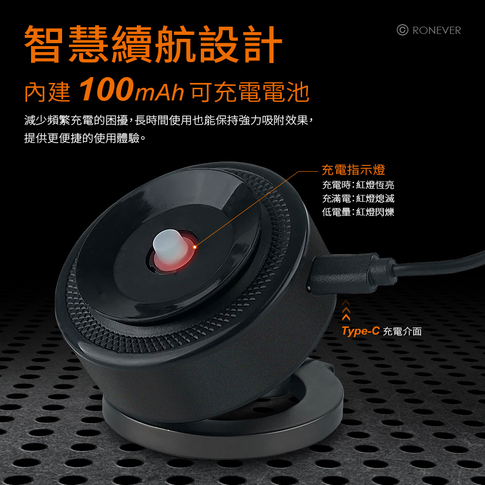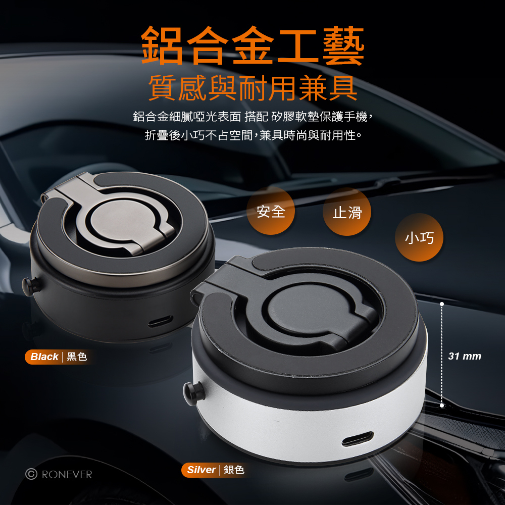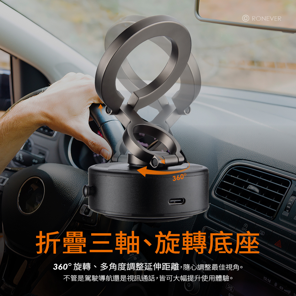 • 電動真空吸盤,光滑平面一鍵吸附。• 摺疊三軸,可多角度調節視角、高度。• N52環狀排列強力磁鐵,快速吸附。• 視支架安裝平面材質可雙向吸附,兼容MagSafe手機殼、適用多種機型。磁鐵規格:N52 (800高斯)x8顆額定電壓:DC 5V/0.3A電池規格:601220鋰聚合物電池 100mAh 充電介面:Type-C 充電時間:約45分鐘材 質:ABS塑膠、PC、鋁合金重 量:約145g產品尺寸:約69x64x31mm(收合)內 容 物:手機支架、充電線、說明書、引磁片、透明輔助貼片、簡易安裝清潔包