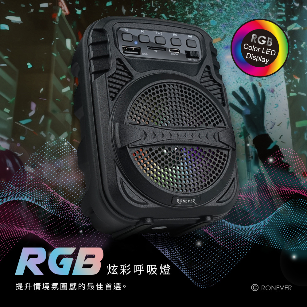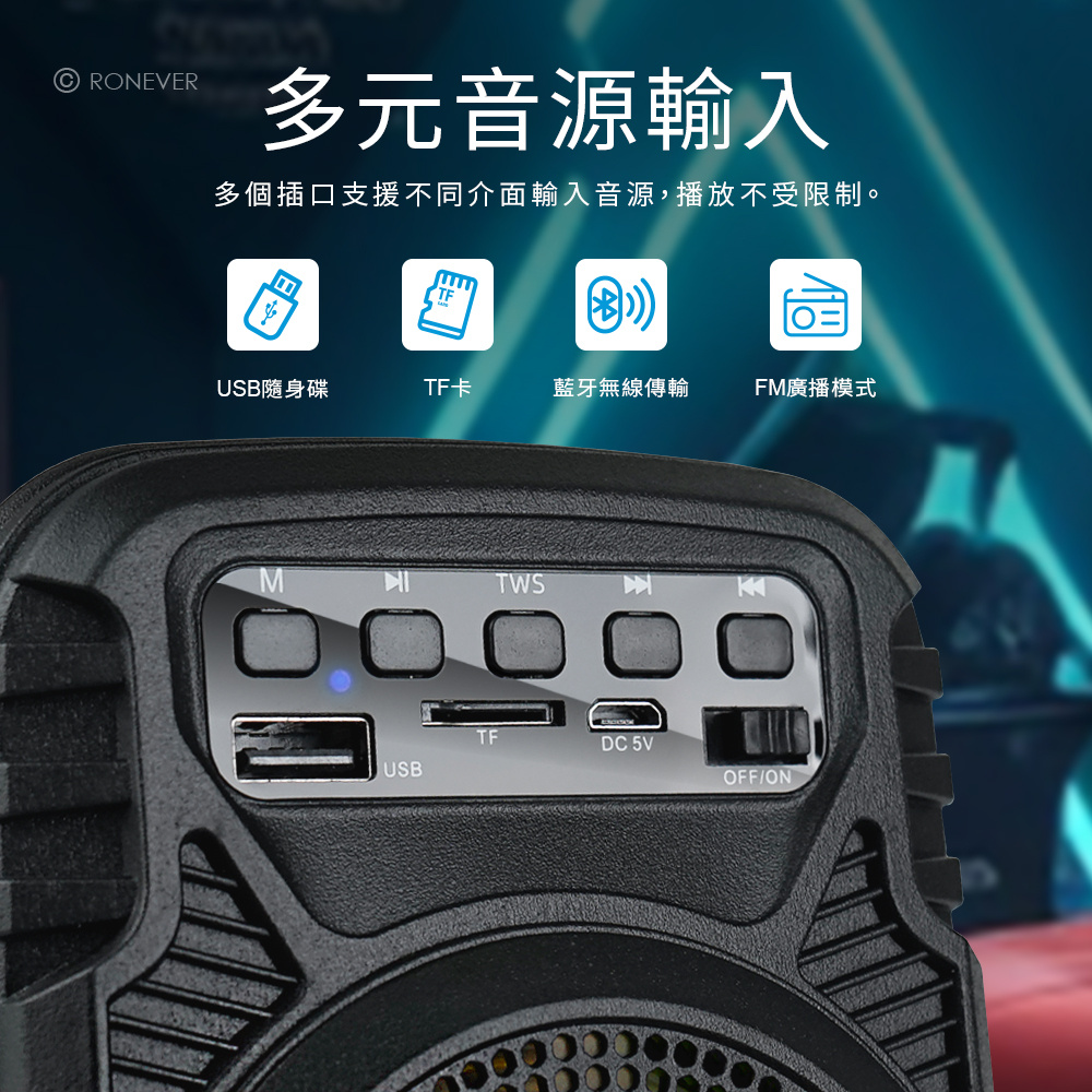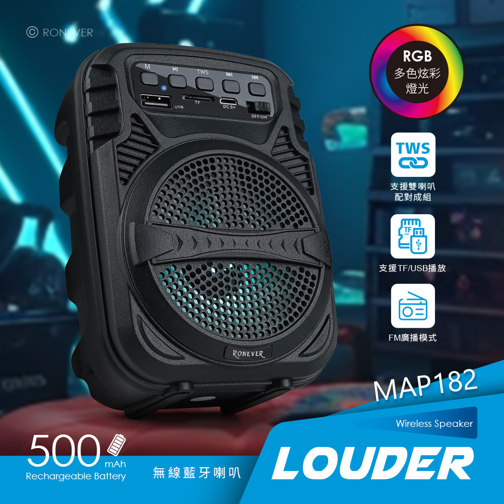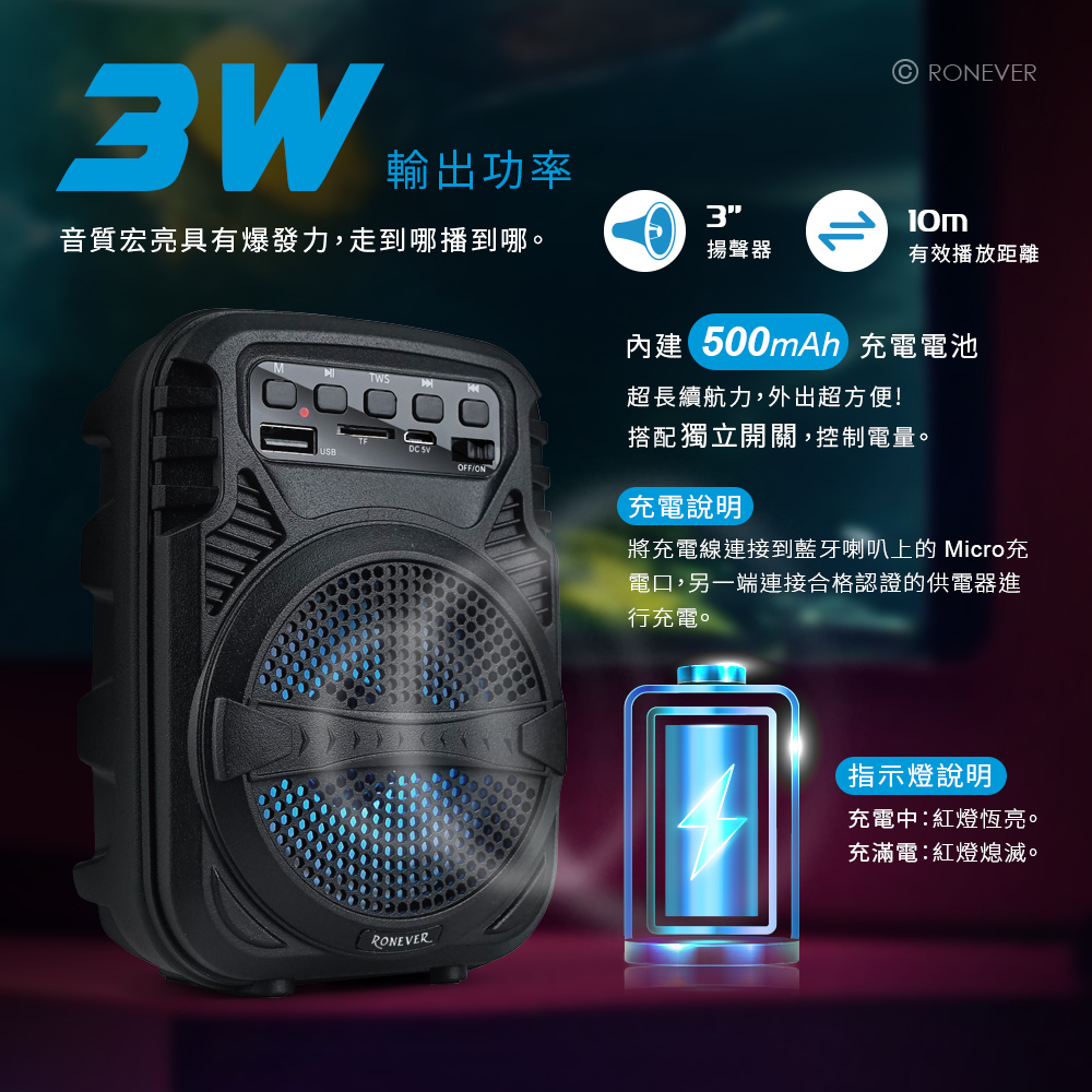 • 支援TF/FM/USB多種介面傳輸播放,多元應用。• TWS連線可同時使用2台藍牙喇叭播放。• RGB炫彩呼吸燈提升氛圍感。• 3W輸出功率、10M有效播放距離,走到哪播到哪,音質宏亮。• LED 狀態指示燈,清晰辨識藍牙配對、充電狀態。• 獨立開關、按鍵,介面簡潔、操作更直覺。• 靜音止滑軟墊 ,音量大時,震動也不傷桌。• 迷你輕巧,便攜機身。藍牙版本︰Bluetooth V5.3額定電壓︰DC 5V/1A輸出功率︰3W揚 聲 器︰3吋內建電池︰14500鋰電池 500mAh充電介面︰Micro USB充電時間︰約2小時播放時間︰約2小時接收範圍︰≧10m產品材質︰PP塑膠、電子零件產品尺寸︰102x81x143 mm重 量︰約 241g線 長︰約 30cm包裝內容︰藍牙喇叭、充電線、說明書