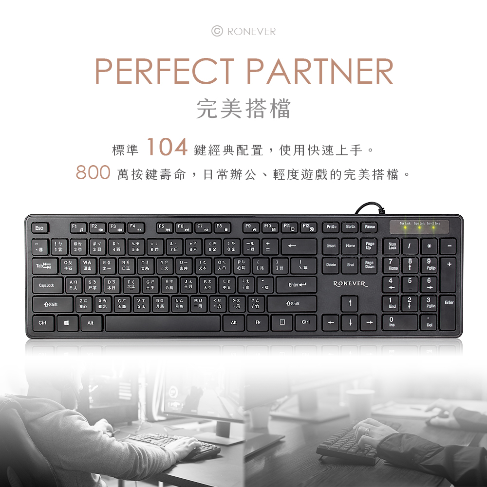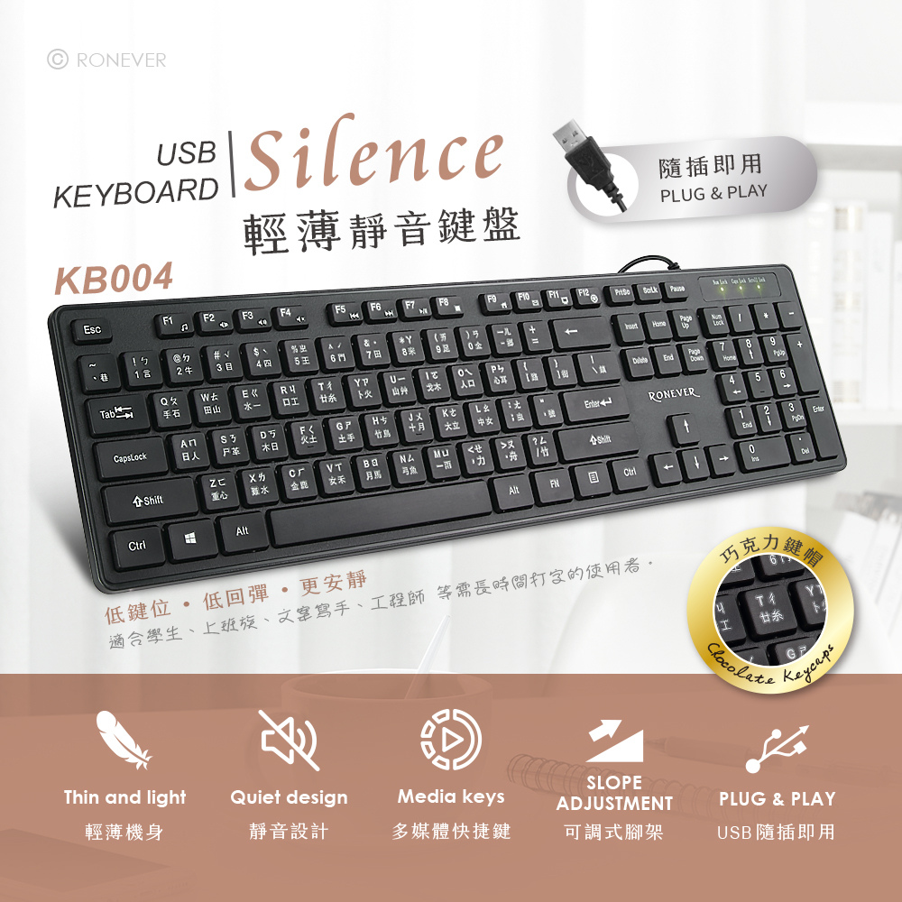 • 扁平鍵帽受力均勻,搭配低鍵位回彈效果更輕盈、安靜,長時間也能有舒適手感。• 標準104鍵搭配12個多媒體快捷鍵,與FN鍵結合可快速切換。• 符合人體工學的可調式腳架,可依需求調整到最舒適的高度。• 機身重量僅393克,厚度約2cm,攜帶、移動輕鬆方便,搭配窄邊設計不占桌面空間。• 巧克力鍵帽均勻受力,搭配底部止滑墊,可有效抗震、防止位移。• 使用USB介面,隨插即用免驅動。介面:USB額定電壓:DC 5V按鍵數:104鍵按鍵壽命:800萬次 材質:HIPS耐衝擊聚苯乙烯、電子零件尺寸:約435x125x21mm重量:約393g線長:約147.5cmBSMI:D51369保固︰非人為因素損壞,保固、保修半年。貨源︰公司貨配件︰鍵盤x1