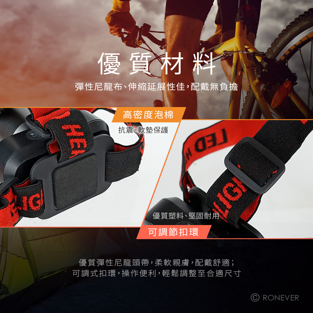 • 強光/弱光/SOS閃爍3段燈光模式切換。• 可伸縮式變焦,依使用情況不同調整,最大射程500M。• IPX4生活防水等級,雨中也能正常使用。• 內建2000mAh充電鋰電池,TPYE-C充電介面,充電方便快速。• 充電燈號指示,充電中顯示紅燈,充飽電隨即轉為綠燈。額定電壓:DC 5V / 1A消耗功率:20W燈珠類型:HJ5050燈光模式:強/弱/閃爍亮度流明:2400流明色 溫:8000K最大射程:500M內建電池:18650鋰電池 2000mAh充電介面:TYPE-C產品材質:ABS塑膠、鋁合金、電子材料燈體尺寸:76x80x44mm重 量:113g包裝內容:頭燈x1、充電線x1、頭帶x1