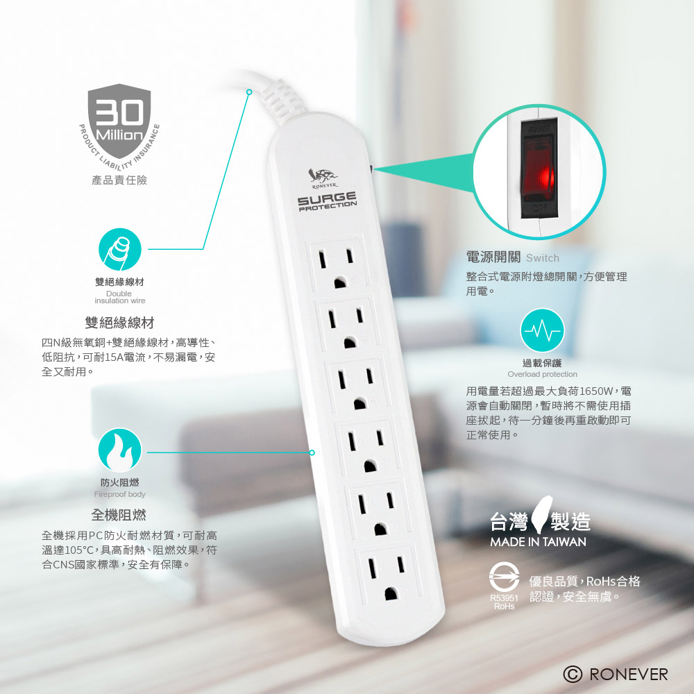 • 全機採用PC防火耐燃材質,可耐高溫達105度C,具高耐熱、阻燃效果,符合CNS國家標準,安全有保障。 • 國家級2.0mm 雙層絕緣電線,線材使用99.99% 4N級高純度無氧銅材質,可耐15A電流,不易漏電,安全又耐用。 • 用電量若超過最大負荷1650W,過載電源開關會自動關閉,請暫時將不需使用之插座拔起,等一分鐘後再將開關切至“RESET ”即可正常使用。 • 集中迴路開關加紅燈,不需使用時請關閉電源,節約不必要的待機電力,節能省電更安全。 型號:ZPR-010 保固:非人為因素損壞,保固、保修半年。 認證編號:C106-4 適用電壓:AC 110V 60Hz 額定電壓:AC 125V 60Hz 額定容量:1650W MAX 最高負載:15A 適用環境:溫度 0°~105° 主要成分:銅、防火PC塑膠 輸出規格:1開關6插座3P插頭