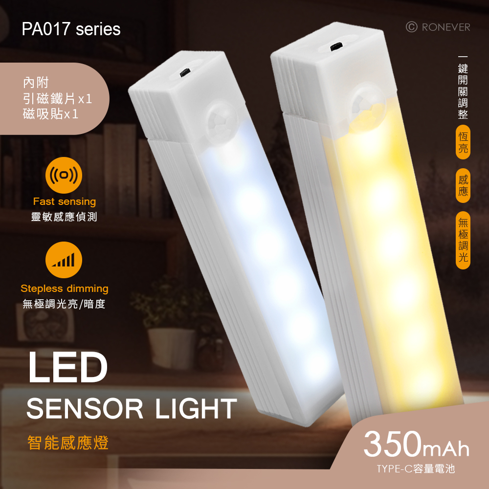 • 掌上型輕巧尺寸,燈光明亮柔和不刺眼。• 人來即亮,靈敏感測到動態時自動開啟,可有效節約能源。• 最大感應範圍3M、感應角度120°,具有全天與夜間感應模式。• 一鍵開關,可切換恆亮、感應、無極調光功能。• 附贈磁吸貼搭配引磁鐵片,安裝便利又快速。• 內建350mAh充電電池搭配Type-C充電介面,供電距離不受限。• 適用於鞋櫃、抽屜、衣櫥、辦公桌...等多種日常使用。額定電壓:DC 5V / 0.3A額定功率:0.25W電池種類:602040鋰聚合物電池電池容量:350mAh充電介面:USB Type-C燈珠類型:LED2835-3V燈珠數量:6顆PA017C色溫:黃光(3000K)PA017W色溫:白光(6500K)使用時間:約5小時充電時間:約3小時感應距離:0~3M感應時間:≤25±3S防護等級:IP20材質:PVC塑膠、電子零件產品尺寸:約104x22x23mm充電線長:約20cm重量:約17g內容物:感應燈x1、說明書x1、引磁鐵片x1、磁吸貼x1、充電線x1