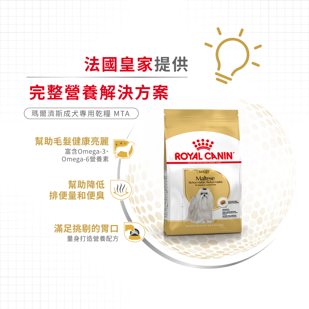 瑪爾濟斯成犬專用飼料,量身訂製顆粒,幫助瑪爾濟斯口腔保健、管理牙垢形成的機率。精準配方滿足挑剔胃口,幫助降低排便量和異味。富含Omega 3、6營養素,幫助毛髮健康亮麗。維持愛犬體態,活力每一天。