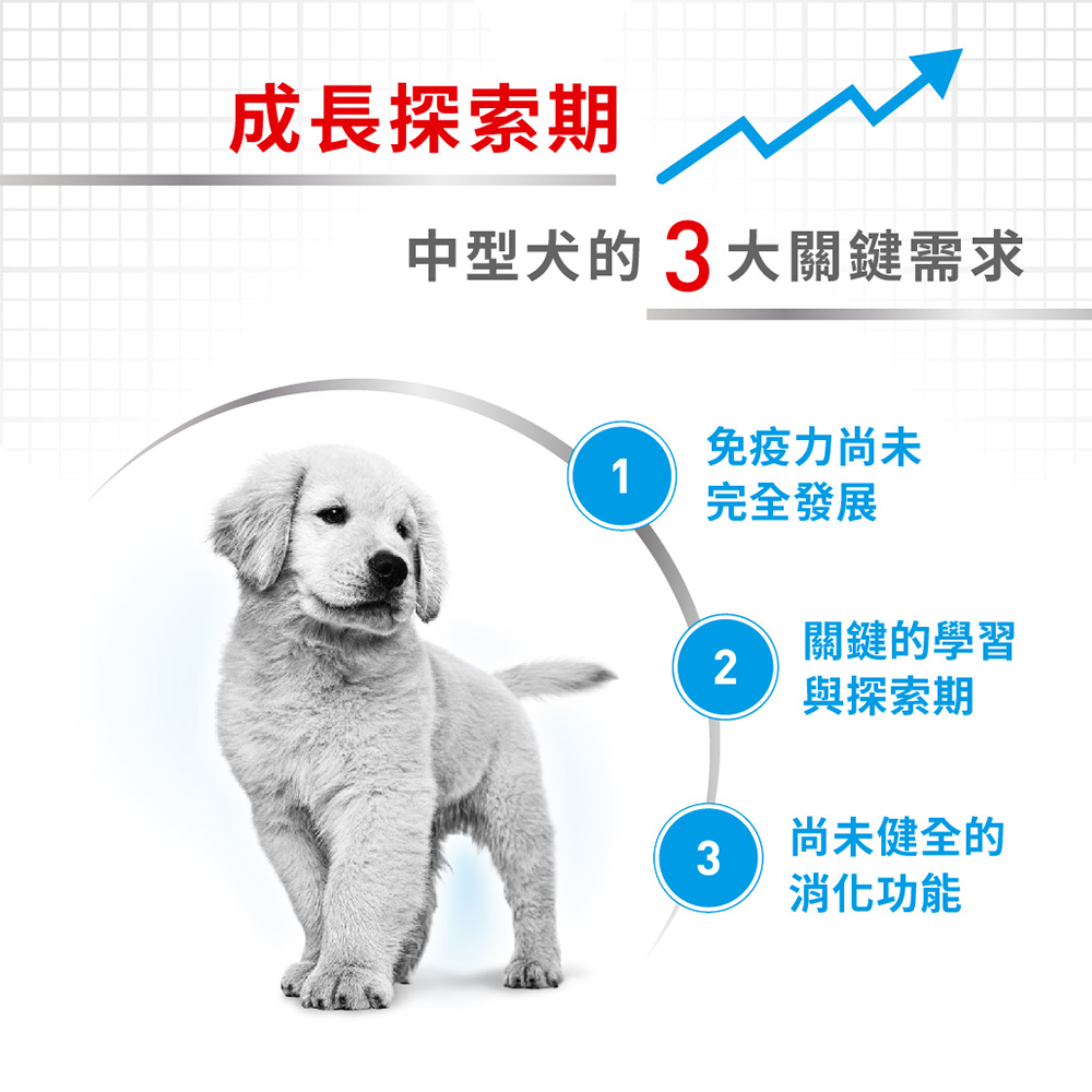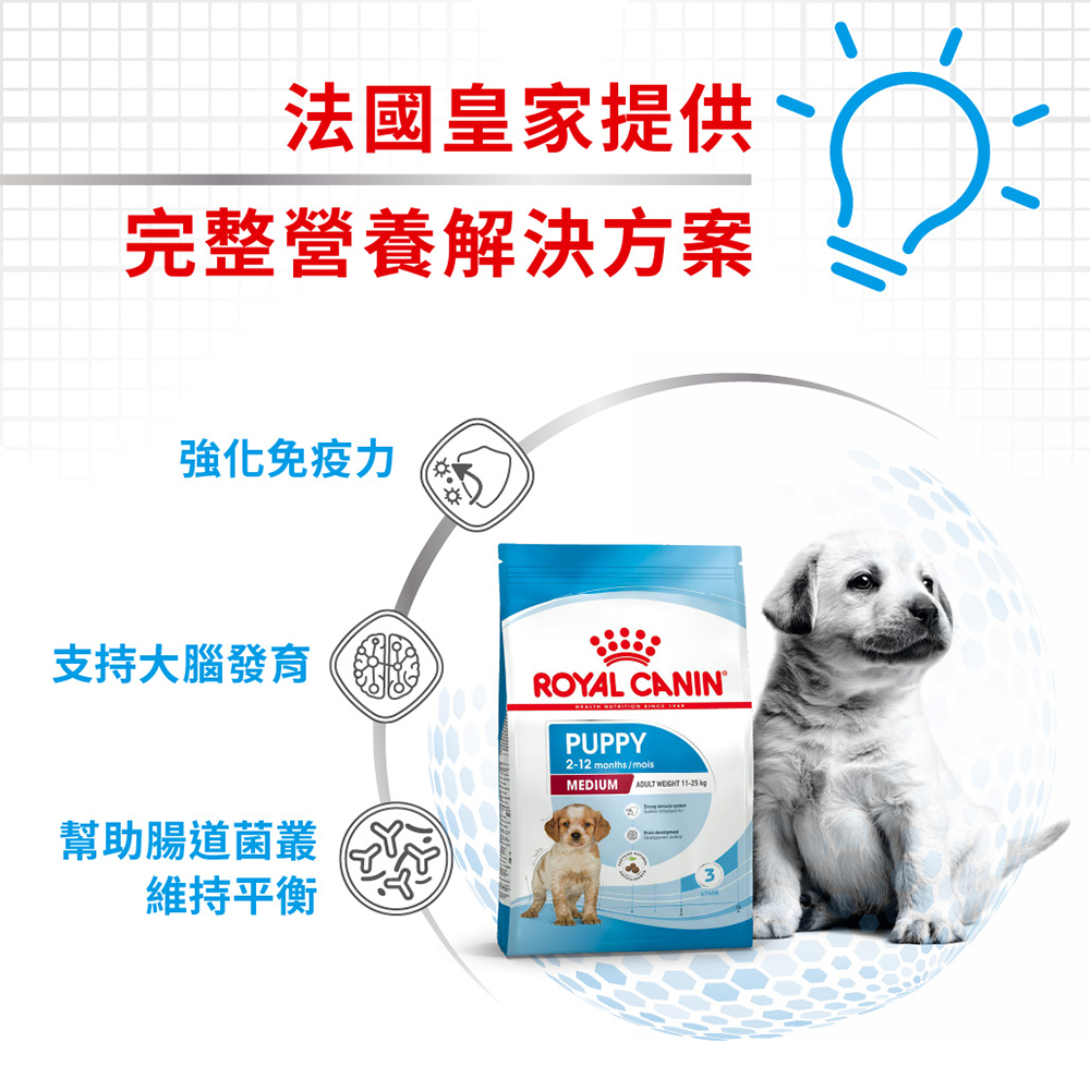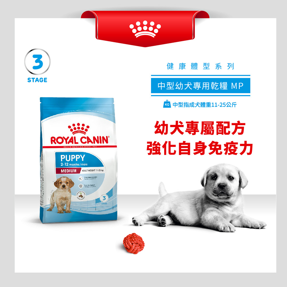 中型幼犬乾糧,適合成犬體重11-25公斤的中型幼犬,幫助維護幼犬免疫力、支持骨骼發展及腸道健康。結合優質蛋白質、維生素與礦物質配方,滿足幼犬成長所需,為健康成長奠定堅實基礎,是中型幼犬飼料的最佳選擇!