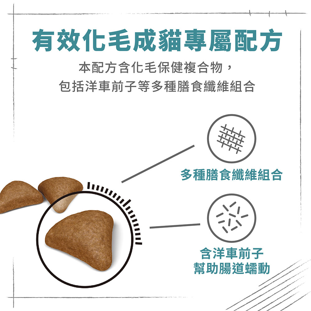IH34 有效化毛成貓專用乾糧,專為有毛球問題的成貓設計,精準均衡的營養配方,隨糞便排出貓咪每天吞下的毛髮,避免累積在腸胃道或由吐毛排出,天然膳食纖維支持腸道自然蠕動,保持愛貓健康活力,遠離毛球困擾。