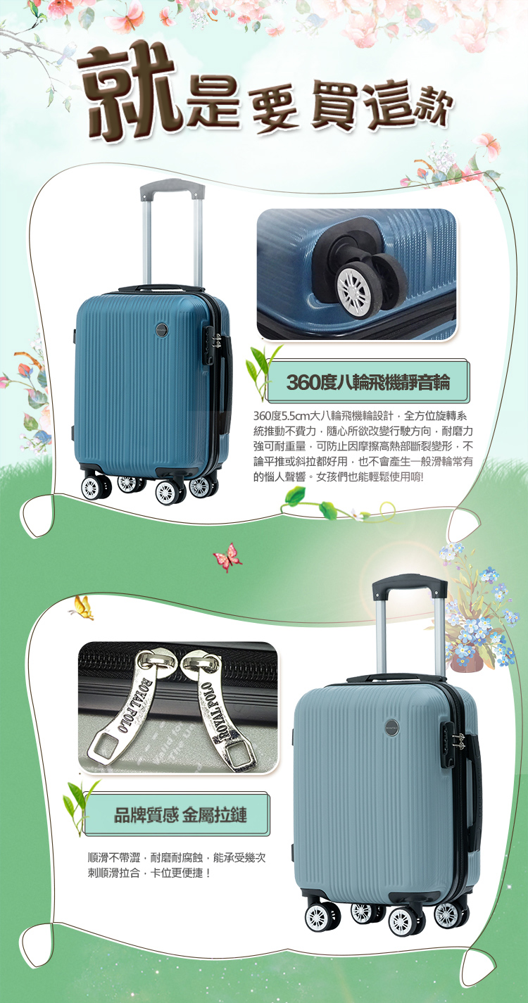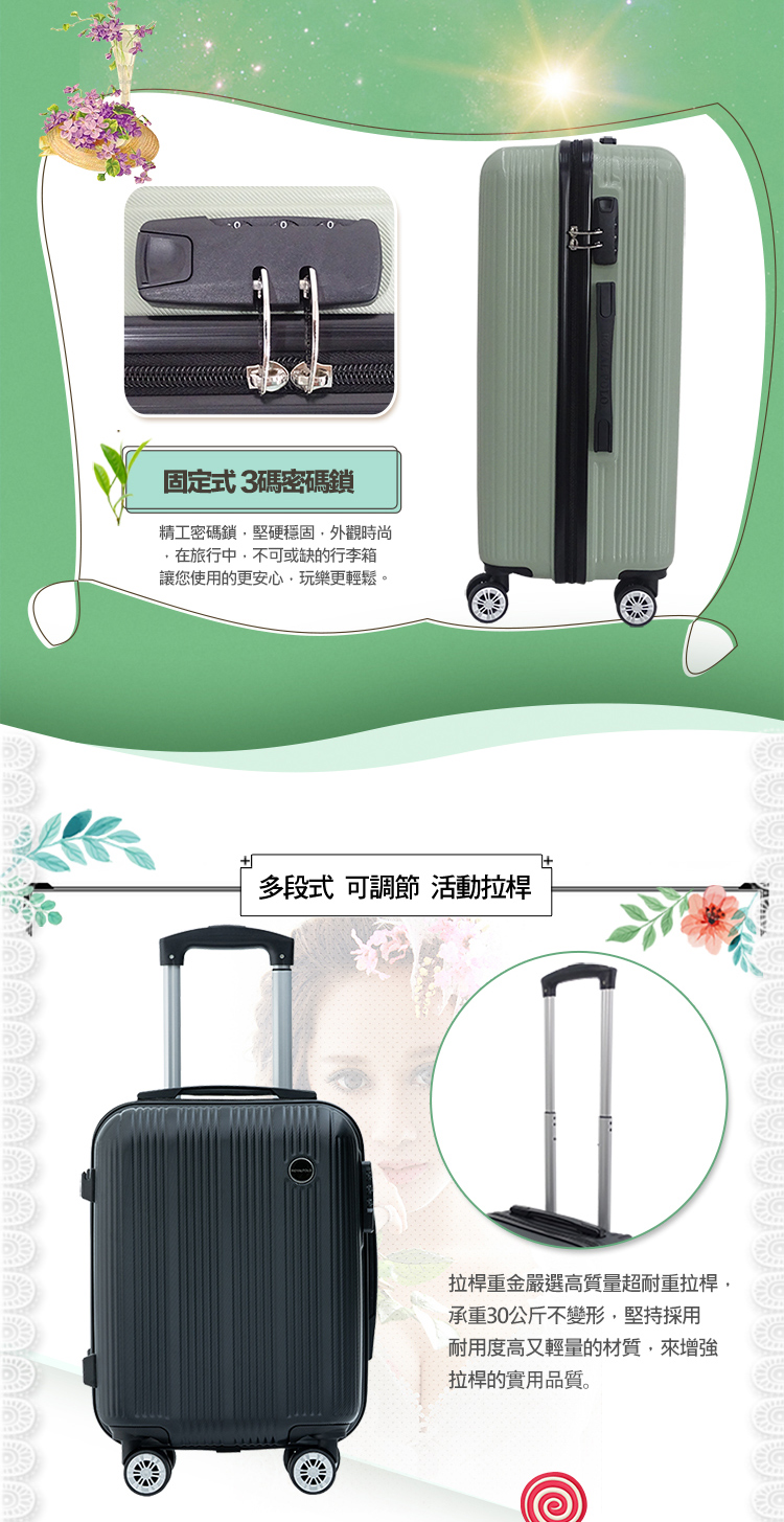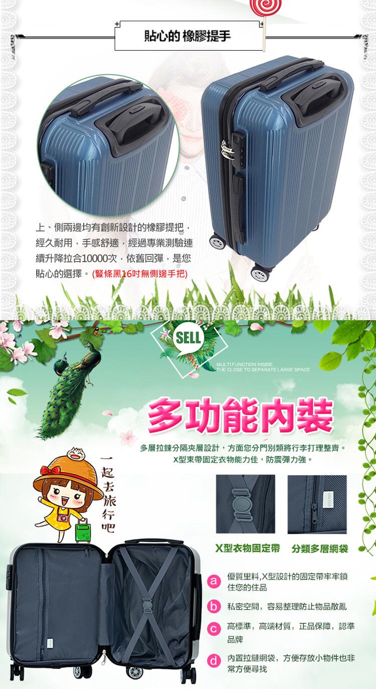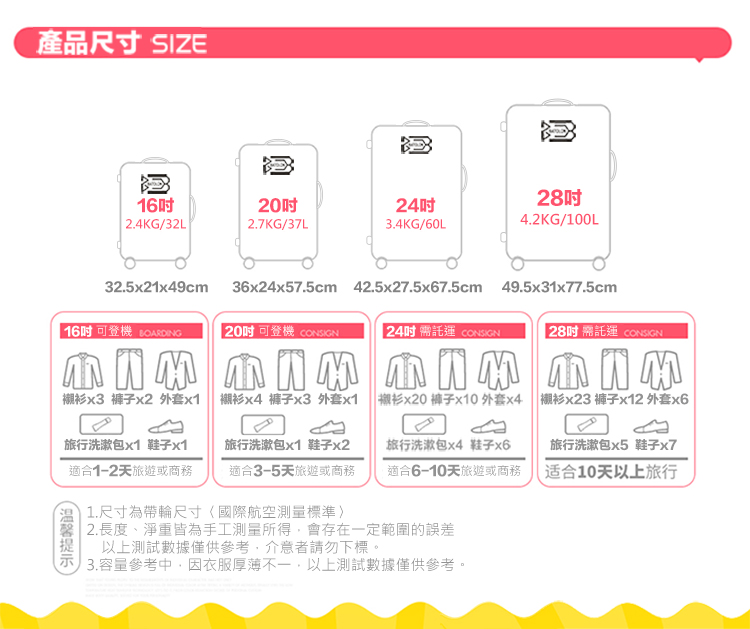 ◆尺寸(長*厚*高,含輪高):16吋/約32.5*21*49cm、20吋/約36*24*57.5cm、24吋/約42.5*27.5*67.5cm、28吋/約49.5*31*77.5cm