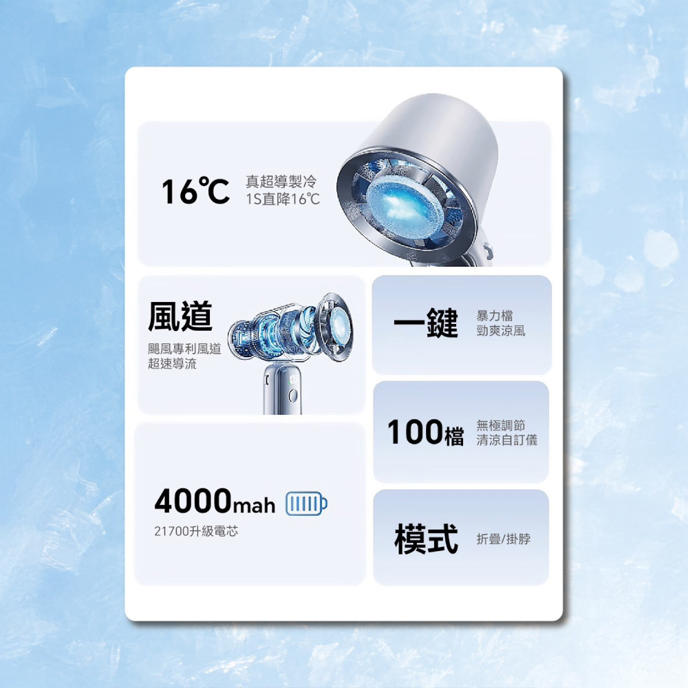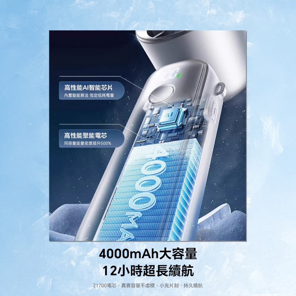 ● 真超導製冷,3秒急速降溫● 小巧時尚,出門必備● 百段風速,隨心掌握● 4000mAh最高續航12小時 產品名稱:RS 冰敷強力風扇產品型號:YF08產品尺寸:54×60×175 mm產品材質:ABS、PC、鋁合金、不鏽鋼、電子元件產品重量:206g±5充電接口:Type-C輸 入:5V⎓2A電池規格:21700鋰電池/4000mAh/3.7V/14.8Wh充電時間:3.5小時工作時間:2.5~12小時(取決於不同檔位/使用場景)產品清單:風扇×1、Type-C充電線、掛繩×1、PE袋、說明書×1◎製冷功能主要設計為貼膚降溫使用,建議將冷卻面輕貼於手腕、額頭或頸部等肌膚部位。◎請注意,在戶外高溫環境中直接吹風,無法產生冷風效果,屬正常現象,並非產品異常。