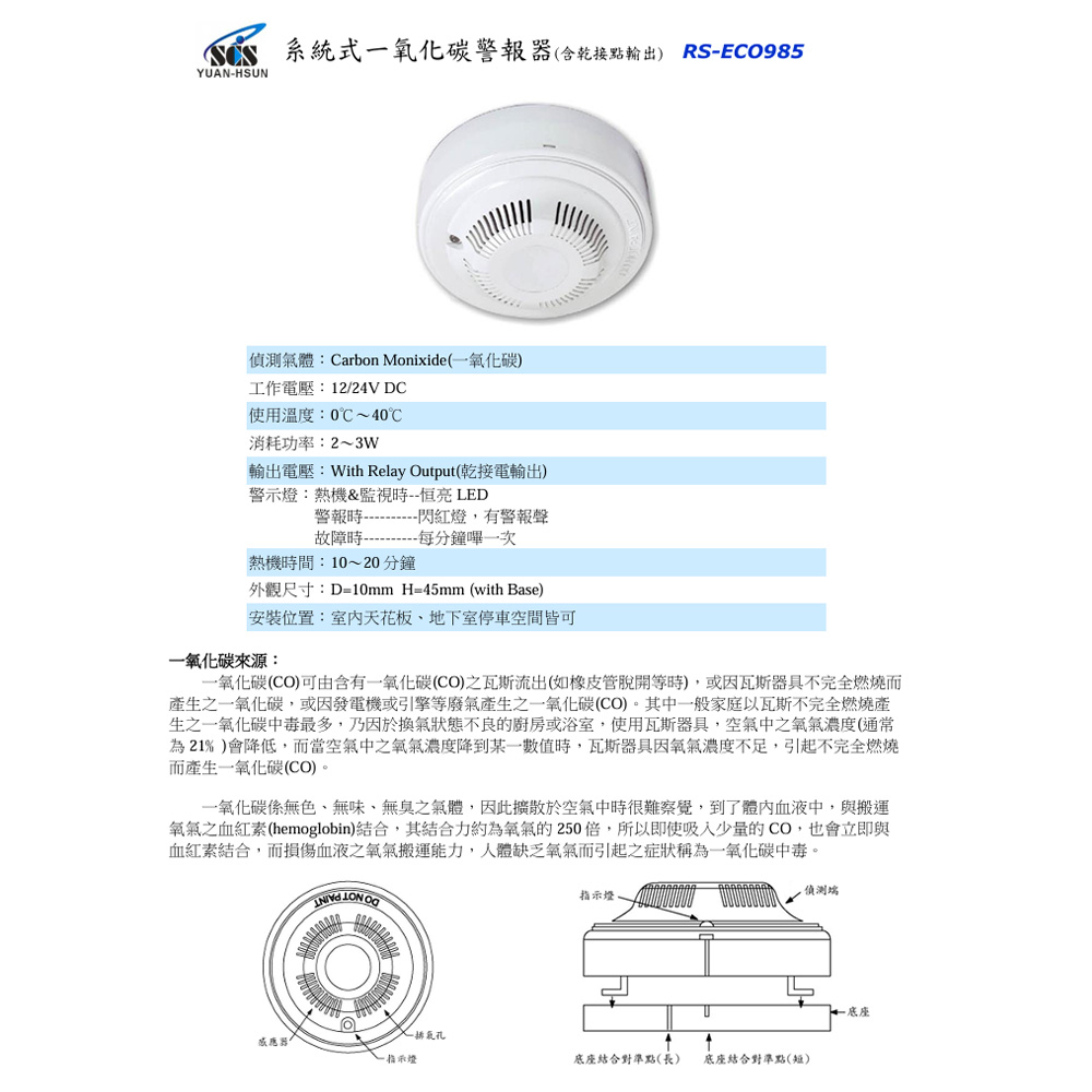 昌運監視器 SCS RS-ECO985 系統式一氧化碳警報器 (含乾接點輸出)