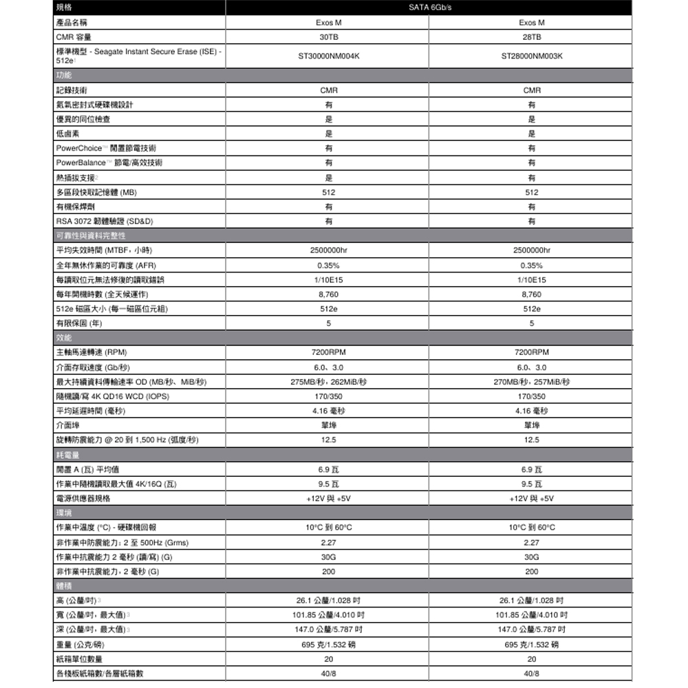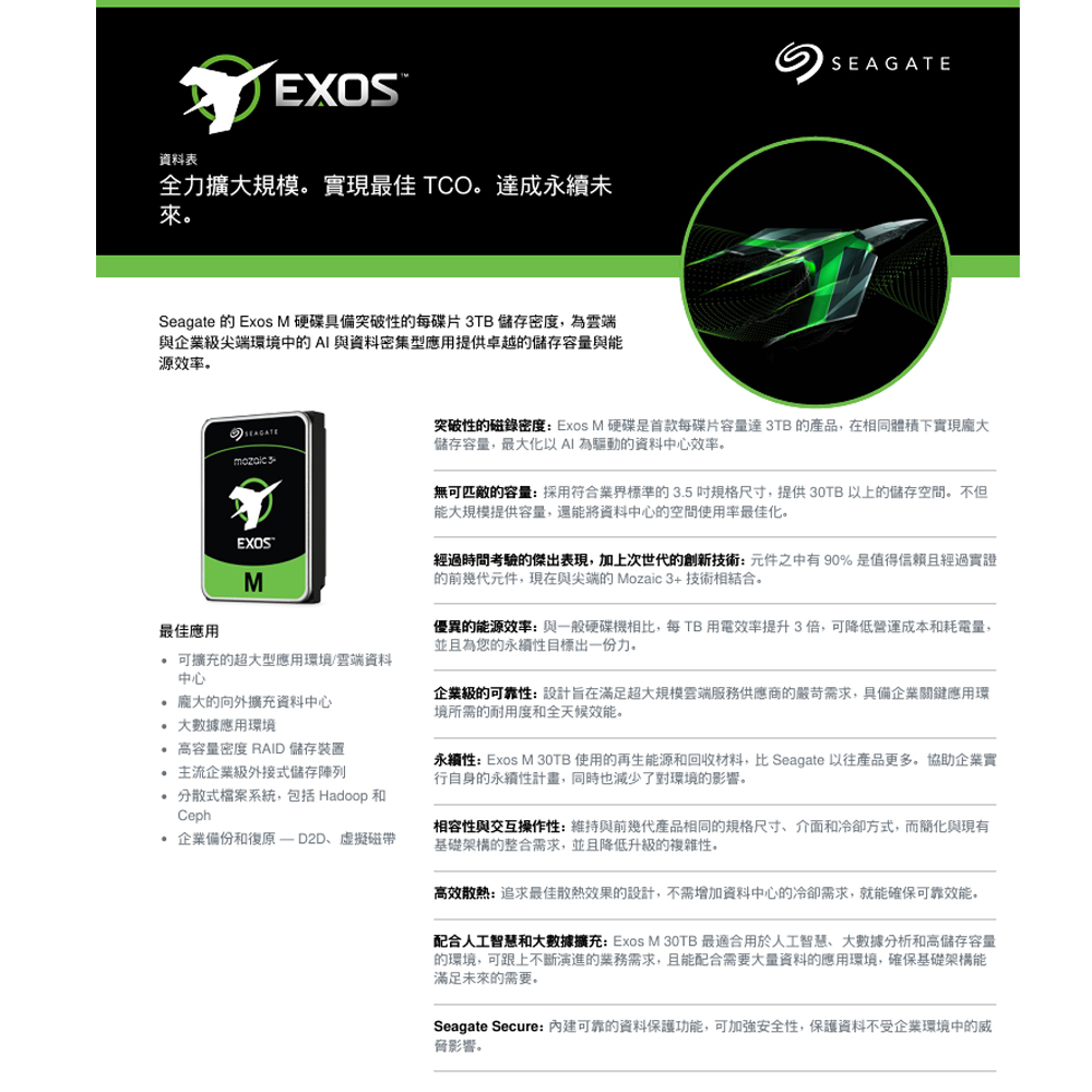 -永續性:Exos M 30TB 使用的再生能源和回收材料,比 Seagate 以往產品更多。協助企業實行自身的永續性計畫,同時也減少了對環境的影響。