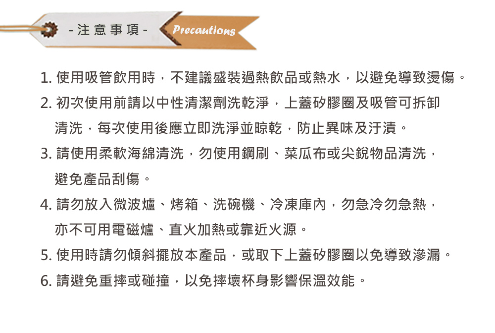 4. 本產品如盛裝或飲用40℃以上的飲品,請待杯內飲品溫度降低後再做飲用,以免燙傷。