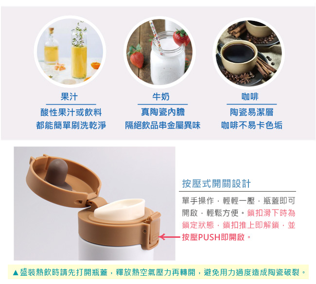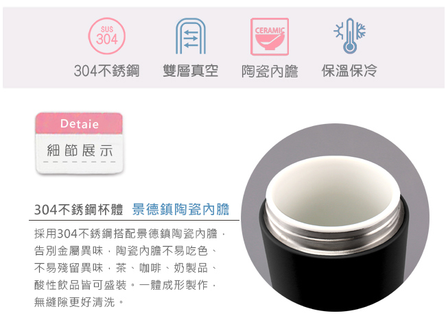材 質:杯身 - 內膽陶瓷、外#304不銹鋼 / 上蓋 - PP、矽膠塞、矽膠止漏圈