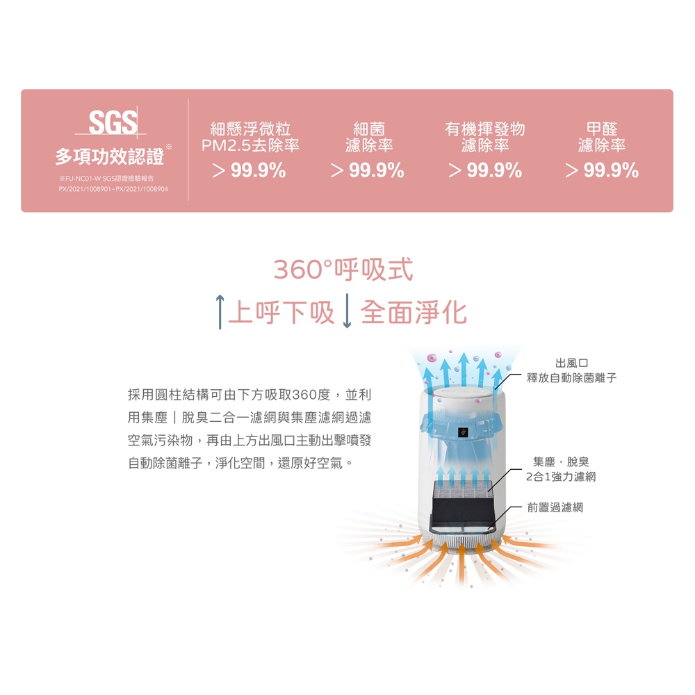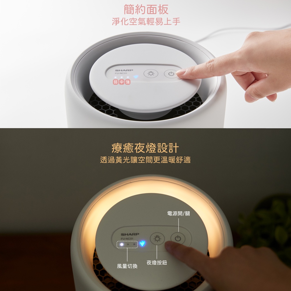 商品特色:搭載夏普獨家高濃度自動除菌離子7000360° 0死角淨化,強力吸入髒空氣,並提供強大的清淨氣流,使室內空氣有效地循環直立圓柱式輕巧設計不占空間(19cmx33cm ),於小房間內可任意擺放。集塵脫臭2合1強力濾網*,有效淨化異味過濾空氣。療癒夜燈設計,溫暖色調陪伴入睡。3段式風力設計(弱、中、強)簡約面版設計,輕易操作上手。SGS認證:PM2.5、細菌、有機揮發物、甲醛濾除率達99.9%*商品規格:型號:FU-NC01-W機身尺寸(寬x高x深)(mm):直徑190x高度330mm噪音比(dB):48(dB)機體重量:2kg適用坪數:3坪特殊功能:除臭功能配件:說明書消耗電功率:20W保固:1年BSMI : R3B801本商品資訊由網路及官網收集彙整而成,僅供參考,如有更新或異動不另外通知,正確商品資訊及規格以實機為準。鑑賞期非試用期,產品一經拆箱、插電及使用皆會影響您退貨權利。