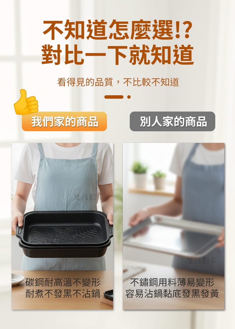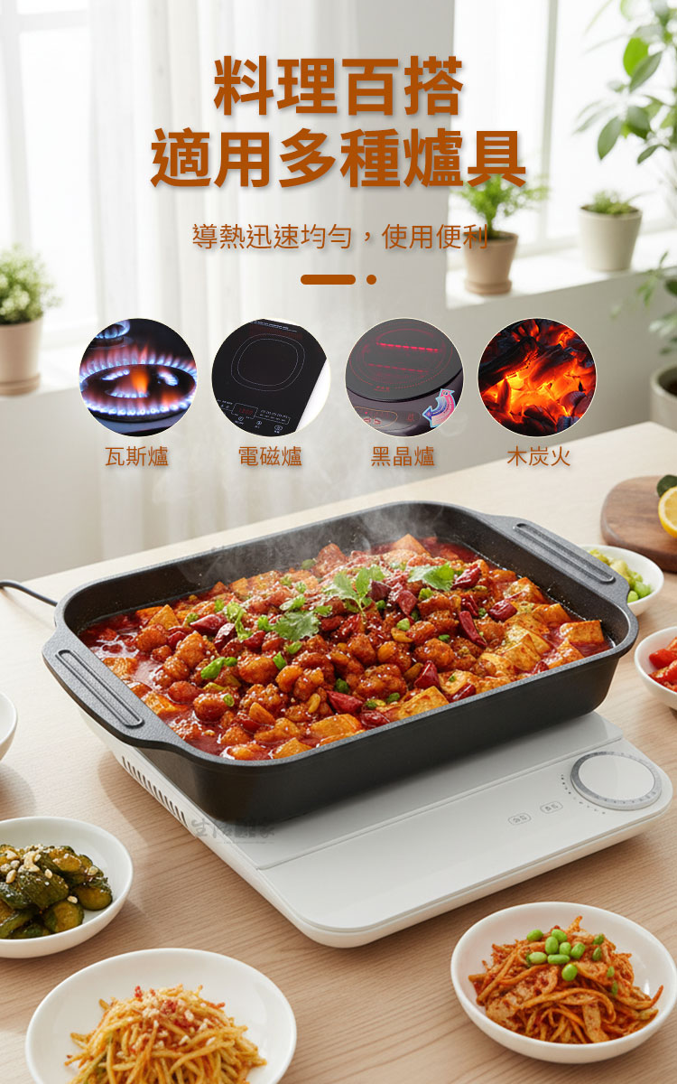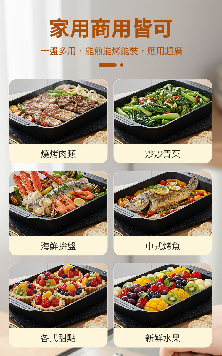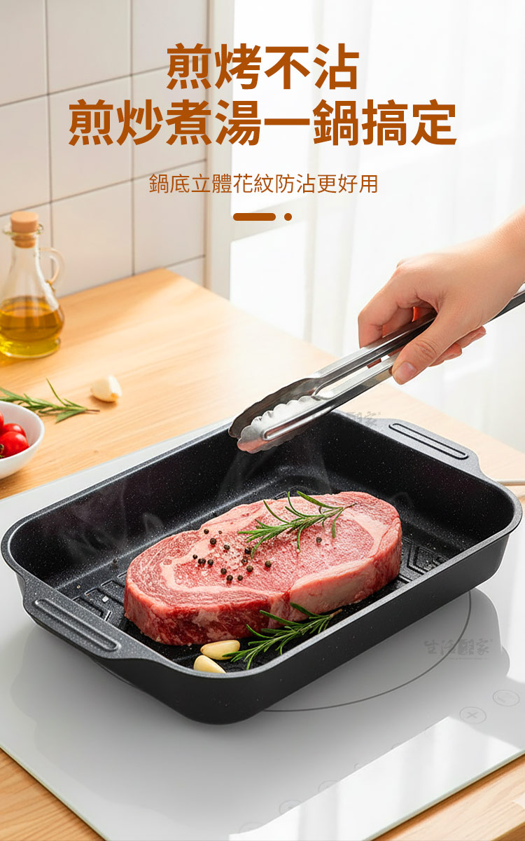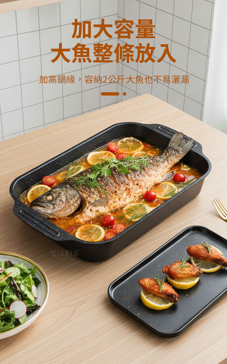 生活采家烤魚專用不沾附蓋加高魚鍋40cm|電磁爐款想在家裡也能煮出餐館級的烤魚料理嗎?🔥這款 生活采家烤魚專用不沾附蓋加高魚鍋40cm,專為愛料理的家庭與烤魚餐館設計,無論是煎、煮、燉、烤,都能一鍋搞定,讓餐桌上的料理瞬間升級。✅ 大容量加高設計:可輕鬆容納2公斤整條大魚,不怕湯汁外溢。✅ 不沾塗層:碳鋼材質搭配內外不沾塗層,煮後不易沾鍋,清洗只需輕輕一擦。✅ 多爐適用:電磁爐、瓦斯爐、黑晶爐、木炭火通通能用,家庭或商用都方便。✅ 附玻璃鍋蓋:鎖住鮮香,透明可視,料理過程一目了然。✅ 一鍋多用:烤魚、燉湯、煎肉、炒菜、海鮮拼盤、甜點烘烤,滿足全家需求。🍲 使用後你會發現~有了這口鍋,烤魚不再只是外出餐館才能享受的料理。您可以:✔️在家裡輕鬆做出川味烤魚、酸菜魚、番茄魚等多種料理。✔️聚會時直接端上桌,視覺美味兼具。✔️減少油煙、避免沾黏,省時省力更健康。如果您正尋找一款 耐高溫、大容量、好清洗的一鍋多用烤魚鍋,這款40cm專用魚鍋將是您的最佳選擇。現在入手,讓家中廚房立即升級為專業餐館!👉 趕快加入購物車,別讓您的下一餐烤魚失敗!#烤魚神器 #不沾鍋具 #家用商用兩用 #大容量魚鍋 #生活采家📣 FAQ (常見問答)Q1:這款烤魚鍋可以用在電磁爐嗎?A1:可以,本產品專為電磁爐設計,同時適用瓦斯爐、黑晶爐、木炭火等。Q2:不沾塗層耐用嗎?會不會容易脫落?A2:採用加厚碳鋼+優質不沾塗層,耐高溫、不易剝落,正常使用可長期保持。Q3:清洗會不會很麻煩?A3:完全不用擔心!只需用清水沖洗或軟布擦拭即可,不易殘留油漬。Q4:容量能放多大的魚?A4:可放入40cm長的魚,約2公斤,完整燉煮或烤製都沒問題。Q5:可以拿來做火鍋或燉湯嗎?A5:當然可以!它是一鍋多用,不只烤魚,還能煮湯、燉肉、烤雞翅、海鮮拼盤。注意事項:1.請避免使用金屬鏟或鋼刷,以免刮傷不沾塗層。2.使用後建議待鍋冷卻再清洗,延長使用壽命。3.適合明火與電磁爐,請避免空燒。4.首次使用建議用清水沖洗並抹一層食用油養鍋。5.請將玻璃蓋避免劇烈碰撞,以免破裂。