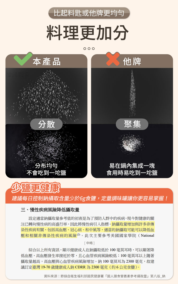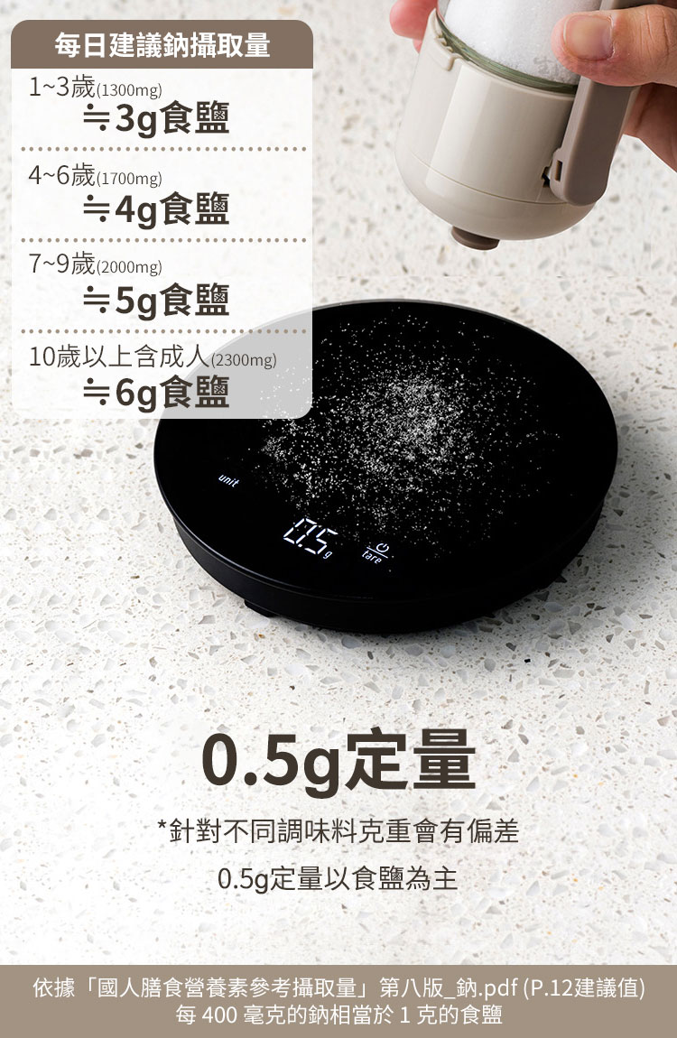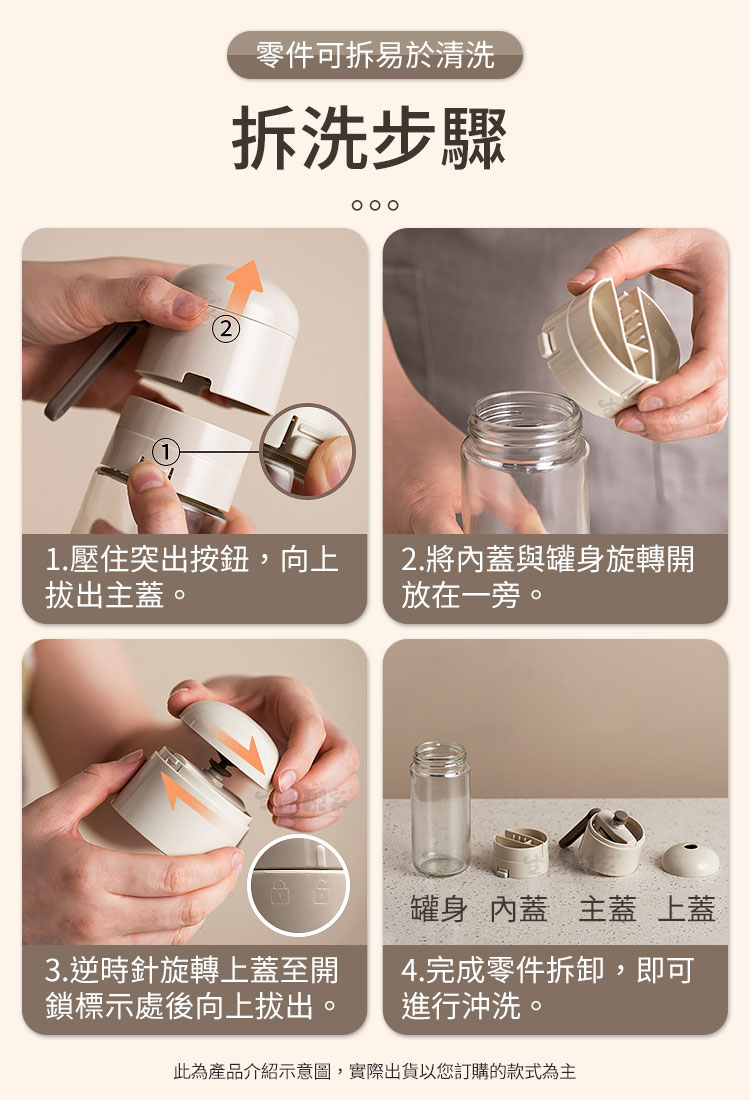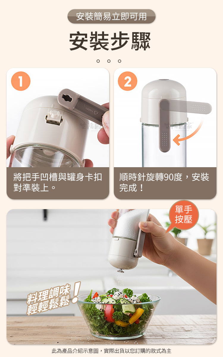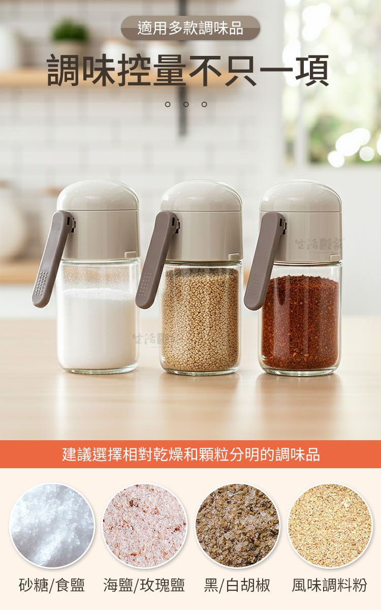 生活采家密封定量玻璃鹽罐|180ml健康控量調味瓶用傳統鹽罐時,總是難以掌握份量,常常一撒就過量。這款 生活采家 密封定量玻璃鹽罐180ml,專為注重飲食均衡與健康的家庭設計,讓您烹飪更安心,吃得更放心。🍳✨✅ 0.5g精準定量:每次按壓固定出鹽,避免調味過量。✅ 密封防潮不卡鹽:特殊結構阻隔蒸氣,防止結塊,撒鹽更順暢。✅ 透明玻璃瓶身:耐用可視化設計,容量180ml,存量一目了然。✅ 多調味料適用:不只食鹽,還能裝糖、胡椒、辣粉、香料。✅ 單手操作輕鬆撒:烹飪時一手按壓,另一手翻炒,料理更順手。✅ 易拆卸清洗:零件可拆,水洗即可,乾淨不藏污。👉 使用後你會發現~👩🍳 炒青菜時,不再因為鹽倒太多而破壞味道;🥩 煎牛排時,鹽能均勻落在表面,風味更均衡;🥗 做沙拉時,也能輕鬆控制用量,健康不多鹽;全家大小都能享受美味又健康的餐桌。別讓過量的鹽分成為健康隱憂!選擇 生活采家密封定量玻璃鹽罐,不僅讓料理更專業,更能養成全家的健康飲食習慣。🔥立即入手,讓「均勻控鹽」成為您的廚房日常!👉 健康飲食,從控鹽開始!#密封定量玻璃鹽罐 #控鹽健康生活 #廚房調味好物 #均勻撒鹽不卡📣 FAQ (常見問答)Q1:這款鹽罐一次能出多少鹽?A1:每次按壓約0.5g,方便精準控量。Q2:除了鹽,可以裝其他調味料嗎?A2:可以,適用砂糖、黑胡椒、辣椒粉等乾燥顆粒調味品。Q3:會不會卡鹽或受潮?A3:不會,本產品採密封防潮結構,有效阻隔蒸氣,避免結塊。Q4:容量是多少?適合家庭使用嗎?A4:容量180ml,適合日常家用,大小家庭都能輕鬆使用。Q5:清洗容易嗎?A5:可拆卸設計,零件簡單沖洗即可,方便保持清潔。注意事項:1.僅適用乾燥顆粒狀調味料,避免液體或潮濕粉末。2.使用後請保持瓶身乾燥,避免水氣進入影響撒鹽。3.建議定期拆卸清洗,確保衛生與順暢使用。4.裝填調味料時,請勿超過瓶身最大容量線。5.請勿放入液體或含油性調料,以免影響按壓功能。