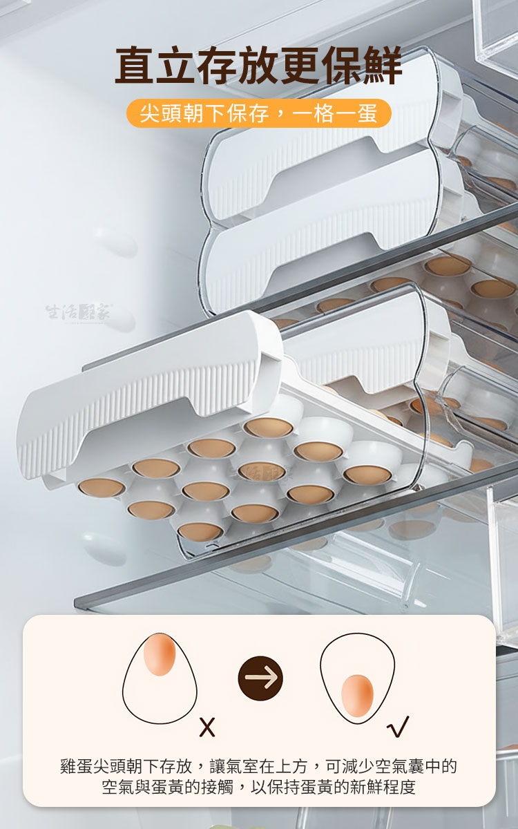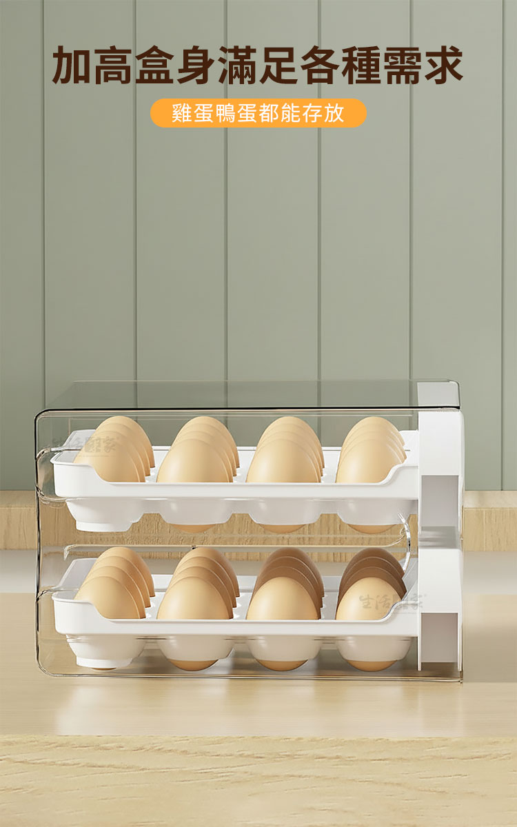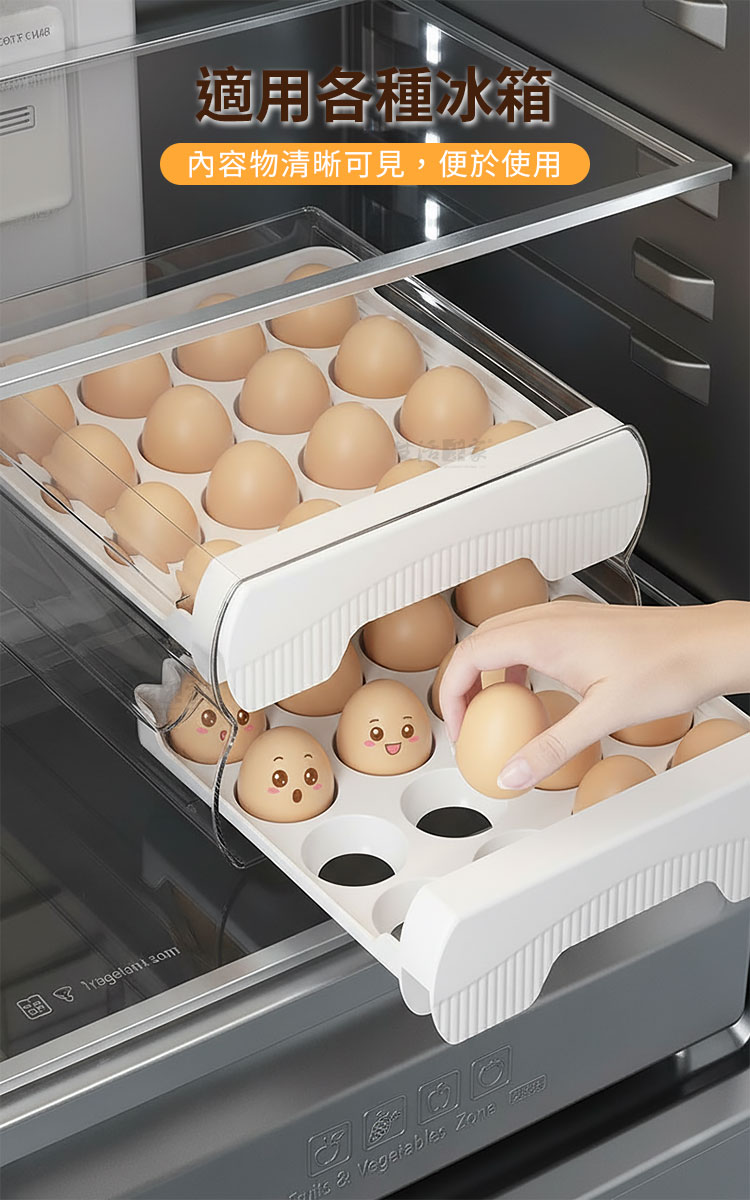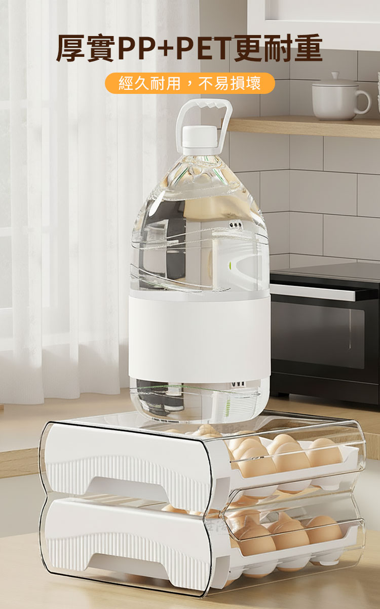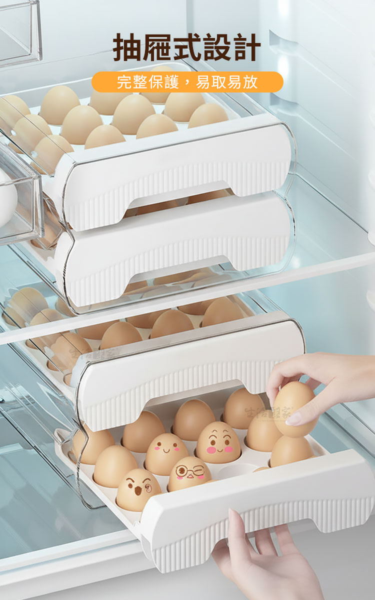 雞蛋買回家,整袋就直接進冰箱嗎?通常我會將每顆蛋洗一洗,再擺上蛋架存放保鮮,一來也不怕蛋殼上的細菌滋生,二來也能確保每顆蛋不會相互碰撞破裂!所以能有一個蛋架讓我存放是很方便的!今天要推薦一款超實用的蛋架「抽屜式雙層32顆保鮮雞蛋架」!雞蛋收納和保鮮一步到位,真的很實用!🍳🌟這款蛋架擁有「32格大容量」,可以一次性收納32顆雞蛋,無論是大雞蛋還是小雞蛋都能輕鬆放下。「加深凹槽設計」,不僅雞蛋,連鴨蛋也能妥善收納。「一格一蛋不碰撞」,保證每顆蛋都能安全保存。🥚🦆「立式存放保鮮加倍」,讓雞蛋保持新鮮,存放時間更長。「抽屜式收納易取易放」,每次取用都非常方便,不用再翻箱倒櫃找雞蛋了。「透明外殼設計」,讓存量一目了然,再也不怕用完了還不知道。🛠️👀這款雞蛋架無論是放在冰箱內還是台面上都非常實用。「髒污好清洗」,清潔起來毫不費力,保持乾淨衛生,使用起來更放心。🧼✨真的是每個家庭的必備好物,讓你輕鬆存放雞蛋,趕快入手吧!你一定會愛上它!🍳🏡#保鮮雞蛋架 #抽屜式設計 #32格大容量 #立式存放 #廚房必備 #高效收納 #家居好物注意事項:1.請勿重摔或高處掉落,以免商品受損。2.請勿接近高溫或勿近火源處,以免商品受損。3.商品情境圖片僅供參考,實際出貨不含週邊道具及配件。