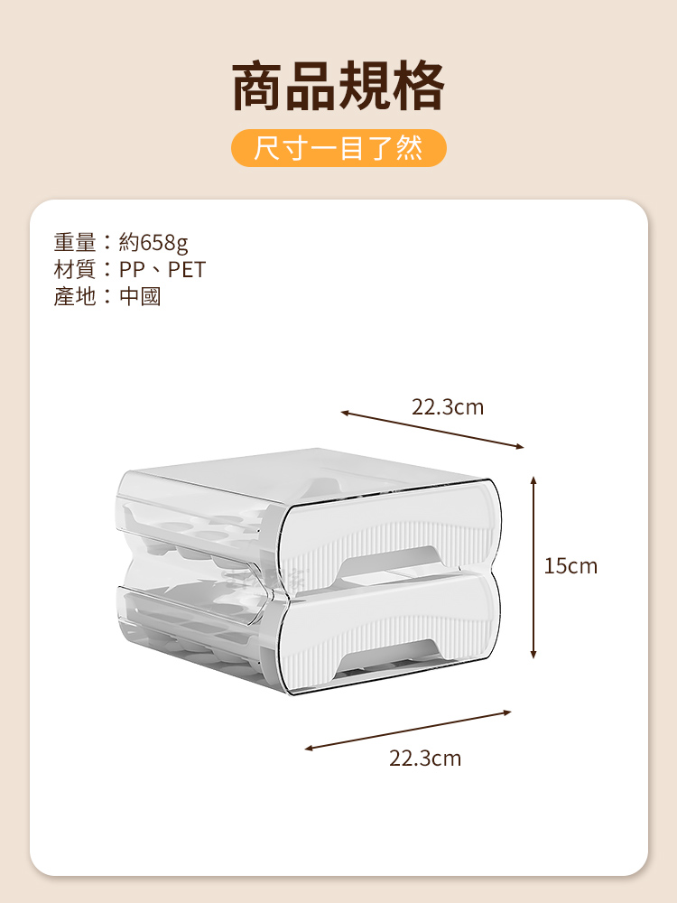 商品規格:1.尺寸:約長22.3*寬22.3*高15cm2.材質:PP、PET塑料3.重量:約658g/組4.產地:中國5.顏色:白色6.商品:抽屜雙層32顆保鮮雞蛋架*1※商品為人工丈量略有誤差,請以實品為準。※網頁圖片因拍攝關係或螢幕設定不同而會與實際商品略有色差,請以實際收到商品為準。