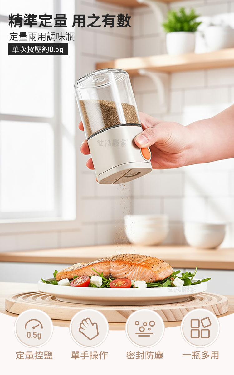 生活采家 二用型定量出鹽調味瓶 180ml|健康飲食的最佳料理幫手你是不是常常做菜時,一不小心就撒太多鹽?😅【生活采家 二用型定量出鹽調味瓶】專為健康飲食設計,單次按壓精準出0.5g,幫助你有效控鹽、減少負擔。✅ 定量出料 0.5g/次 — 精準控鹽,減少過量攝取,養成健康飲食習慣。✅ 單手操作設計 — 烹飪過程中輕鬆按壓,簡單省力,料理不慌亂。✅ 雙用設計 — 一瓶兩用,可切換「定量控鹽」與「大顆粒直出」模式,靈活應對各種食材需求。✅ 密封防潮結構 — 採雙重密封,有效阻隔水氣與油煙,避免調味料結塊。✅ 加厚玻璃瓶身 — 耐磨耐用,容量180ml,透明可視剩餘量,方便即時補充。✅ 可拆洗結構 — 全身可拆卸,零件好清潔,無死角不藏汙納垢。👉 使用後你會發現~🌿 鹽不再忽多忽少,調味均勻健康。🍲 烹飪效率提升,單手即可操作。🥗 不只是鹽,糖、胡椒、孜然、辣椒粉、芝麻…多種調味料都能輕鬆使用。💧 廚房環境潮濕也不怕,調味料保持乾燥不結塊。✨ 無論是日常家常菜,還是健康控鹽飲食,都能帶來滿滿便利感。還在用傳統撒鹽罐嗎?容易倒太多、結塊、不均勻,讓料理大打折扣。選擇【生活采家 二用型定量出鹽調味瓶】,讓每一道菜都精準調味,健康又美味!立即入手,成為您廚房的最佳助手!👉 快把它加入購物車,提升料理質感,讓健康控鹽成為生活習慣!#健康控鹽 #廚房必備 #定量調味瓶 #防潮設計 #生活采家📣 FAQ (常見問答)Q1:每次出料的份量是多少?A1:每次按壓約 0.5g,適合控鹽、控糖、控胡椒等精準調味需求。Q2:可以放哪些調味料?A2:適用於食鹽、白砂糖、黑胡椒粉、孜然粉、辣椒粉、芝麻等各類粉末或顆粒調味料。Q3:會不會因潮濕而結塊?A3:瓶身採雙重密封設計,有效防潮、防油煙,保持調味料乾燥。Q4:清潔方便嗎?A4:可全身拆卸,玻璃瓶身與上蓋零件皆可單獨清洗,乾淨無死角。Q5:容量是多少?能放多久?A5:容量約180ml,一般家庭日常使用可存放約1-2週調味份量,依實際使用情況而定。注意事項:1.請避免裝入含水分或過於黏性的調味料,以免堵塞。2.不同調味料重量略有差異,0.5g為參考值。3.使用後請保持瓶身乾燥,延長使用壽命。4.勿靠近火源或高溫環境,以免影響塑件與玻璃結構。5.清潔時建議以清水沖洗,避免使用強酸或強鹼清潔劑。商品規格:1.尺寸:約長6.5*寬6.5*高12.5cm2.材質:蓋子-PP塑料、瓶身-鈉鈣玻璃3.容量:180ml4.重量:約208g/入5.產地:中國6.商品:二用型定量出鹽調味瓶180ml_灰白*1※商品為人工丈量略有誤差,請以實品為準。※網頁圖片因拍攝關係或螢幕設定不同而會與實際商品略有色差,請以實際收到商品為準。