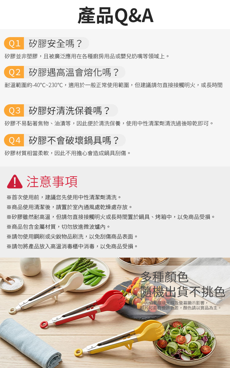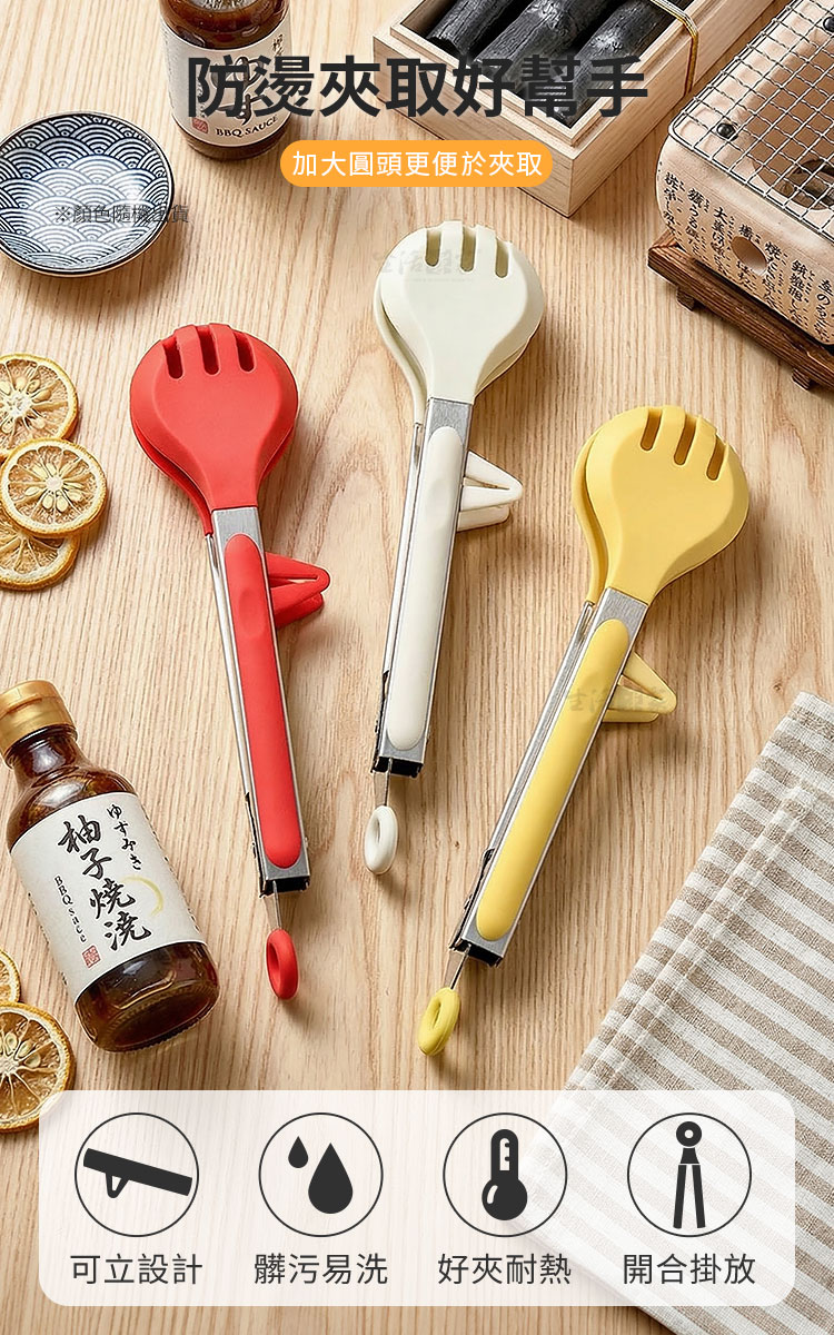 生活采家:讓料理更優雅的「立式矽膠防燙食物夾」 您是否也遇過~料理到一半,食物夾隨手放會弄髒檯面?或是擔心金屬夾刮傷昂貴的不沾鍋?😥 生活采家矽膠防燙食物夾 為此而生。這不僅是一把夾子,更是您廚房裡的「」。結合了 430 不鏽鋼的堅韌與食品級矽膠的溫柔,讓每一場烹飪都顯得從容不迫。✨ ✅ 加大夾面設計: 加大夾取面積,麵包、沙拉、肉類、水煮蛋都能輕鬆夾取。💯 ✅ 貼心立式支架設計: 夾頭不碰桌面,杜絕細菌交叉感染,檯面始終乾淨如新。🧼 ✅ 食品級矽膠材質: 耐高溫、不溶出,專為不沾鍋設計,保護鍋具不刮傷。🍳 ✅ 工學防滑手柄: 好拿好握,即使手濕也能穩穩抓取大塊牛排或滑溜麵條。🥩 ✅ 伸縮尾環鎖扣: 拉起即鎖定,掛勾收納不佔空間,單手操作超滑順。💪 👉 使用後你會發現~ 用了這款食物夾後,不再需要額外的碟子來墊夾子。無論是翻面煎魚、夾取剛出爐的氣炸鍋炸雞,還是分裝沙拉,它的防滑矽膠頭都能提供極佳的夾取力度,讓你像專業主廚一樣優雅。🥗 👉 如果你正在找一支: ✔ 耐熱料理夾 ✔ 不傷鍋食物夾 ✔ 可立式料理夾 ✔ 廚房必備料理工具 這款 矽膠防燙食物夾會是非常實用的選擇。👍 日常料理更輕鬆,廚房更整潔, 一支好用的料理夾,真的會讓做菜變得更舒服。 立即入手,讓料理更順手 🍳 #料理夾 #矽膠食物夾 #廚房料理工具 #不傷鍋料理夾 #廚房好物推薦 📣 FAQ (常見問答) Q1:這款食物夾的矽膠材質耐熱嗎? A:採用食品級耐高溫矽膠,可耐溫-40°C~230°C,適用於煎炒、燒烤及氣炸鍋夾取使用。 Q2:立式支架真的不會倒嗎? A:支架重心設計平穩,放下夾子時夾頭會自然懸空,確保衛生且不晃動。 Q3:可以用洗碗機清洗嗎? A:不鏽鋼與矽膠材質均支援洗碗機,清潔方便不殘留異味。 Q4:矽膠頭會不會很容易脫落? A:矽膠與不鏽鋼骨架採用高強度一體式包覆工藝,經久耐用。 Q5:不沾鍋真的不會被刮傷嗎? A:矽膠材質柔軟且具備彈性,正常使用下不易刮傷鍋具,延長鍋具壽命。 Q6:適合哪些料理使用? A6:可用於夾菜、燒烤、沙拉、麵包、煎蛋等多種料理場景。 Q7:不用時好收納嗎? A7:附伸縮鎖扣設計,上拉即可鎖定,方便吊掛收納不佔空間。 注意事項: 1.請先以中性洗劑清洗乾淨後再行使用。 2.矽膠雖耐高溫,但請勿直接接觸瓦斯爐明火。 3.清洗後請擦乾水分,並拉起尾端鎖扣掛置通風處。 4.請勿讓孩童將其視為玩具嬉戲,避免夾傷風險。 5.若夾取重口味食物(如咖哩),建議及時清洗以防矽膠吸附餘味。。 商品規格: 1.尺寸:約長24.5*寬6*高3.5cm 2.材質:矽膠、430不鏽鋼 3.重量:約123g/支 4.耐熱:-40℃~230℃ 5.產地:中國 6.顏色:紅、黃、白(隨機出貨) 7.適用:防燙、烹飪、料理、烘培等 ※商品為人工丈量略有誤差,請以實品為準。 ※網頁圖片因拍攝關係或螢幕設定不同而會與實際商品略有色差,請以實際收到商品為準。