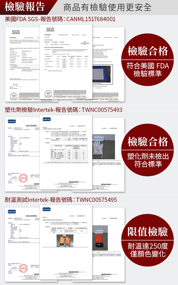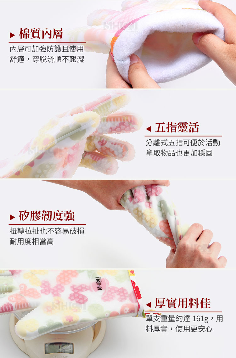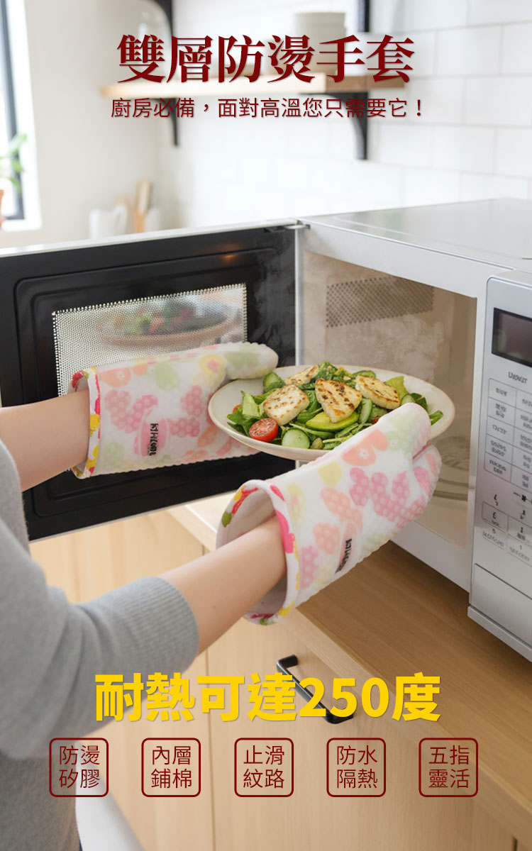 五指型雙層防燙矽膠隔熱手套|耐熱250°C廚房防燙安全手套 微波爐或氣炸鍋取出熱盤時,傳統布手套太厚重、不靈活,差點滑落?抹布髒衣污不衛生?或者高溫蒸氣滲透布料造成燙傷?生活采家五指型雙層防燙矽膠隔熱手套 為了優化您的烹飪體驗而生。我們深知,一份完美的料理,不應伴隨燙傷的風險。 ✔ 耐熱250°C防燙設計 通過耐熱測試,高溫環境下可有效隔熱,適合日常料理與烘焙使用。 ✔ 雙層結構隔熱更安心 外層矽膠隔熱、防水易清洗;內層布質柔軟舒適,提升使用觸感。 ✔ 防滑紋路穩定抓握 表面凹凸紋路增加摩擦力,端鍋、拿盤不易滑落。 ✔ 五指靈活操作 分指設計可靈活抓握餐具與鍋具,比傳統手套更好操作。 ✔ 吊掛收納設計 手套尾端附掛環,清洗後可吊掛風乾,不占廚房空間。 ✔ 高品質安全可靠 SGS及全國工證Intertek檢驗合格,不含有害化學物質,能耐高溫👍,確保您的手部安全。 🍳多種廚房場景都適用 這雙手套不只是烤箱手套,更是廚房多用途防燙工具: ✔ 瓦斯爐料理拿鍋 ✔ 微波爐取餐盤 ✔ 電鍋蒸盤取出 ✔ 蒸鍋端盤 ✔ 烘焙烤箱使用 ✔ 換燈泡、開罐、拿調理包 從料理準備到餐桌端盤,都能派上用場。 ✨使用後你會發現~ 很多家庭在廚房其實都忽略了一件事: 安全與穩定的高溫防護。 ✔ 拿熱鍋不再緊張 ✔ 端盤更穩定不滑落 ✔ 料理更安心 ✔ 廚房操作更順手 這不只是一雙手套,而是 提升料理安全感的小工具。 現在準備一雙更安心! 👉 如果你經常使用: ✔ 烤箱 ✔ 蒸鍋 ✔ 電鍋 ✔ 微波爐 那麼一雙耐熱、防滑、雙層隔熱的防燙手套,絕對是廚房必備配件。 讓每一次端盤、拿鍋、開鍋蓋,都更加安心。 #廚房防燙 #矽膠隔熱手套 #料理安全 #隔熱必備 #廚房好物 📣 FAQ (常見問答) Q1:這款手套最高耐熱多少度? A:圖片顯示耐熱測試可達約250°C,在一般廚房料理環境下可提供有效隔熱保護。 Q2:手套可以接觸水嗎? A:外層為矽膠材質,具有防水特性,遇到油汙或水漬也較容易清洗。 Q3:手套會不會很難穿脫? A:內層為棉質設計,穿脫較順手,不易卡手。 Q4:可以用於烤箱或蒸鍋嗎? A:可以,烤箱、蒸鍋、微波爐與電鍋取餐具都適合使用。 Q5:清洗方式是什麼? A:可用清水沖洗或搭配中性清潔劑清洗,並吊掛晾乾即可。 注意事項: 1.請勿讓手套直接接觸爐火或長時間放置於高溫熱源旁,以免材質受損。 2.請勿使用尖銳刀具劃傷手套表面,以免影響防水與隔熱效果。 3.雖然矽膠具備極佳防滑性,但在抓取表面沾滿大量油脂的器皿時,仍需確保抓穩。 4.本產品建議耐熱溫度為 250°C,請勿用於工業級超高溫環境。 5.清洗後建議利用側邊吊掛孔懸掛晾乾,避免內襯長期受潮。 商品規格: 1.尺寸:約長28*寬20*厚4.4cm 2.材質:矽膠、棉布 3.重量:約156g±5%(入) 4.產地:中國 5.數量:1雙 6.耐溫:250度 7.檢驗:美國FDA(SGS-CANML1517684001)、塑化劑 檢驗(Intertek-TWNC00575493)、耐溫 測試(Intertek-TWNC00575495)