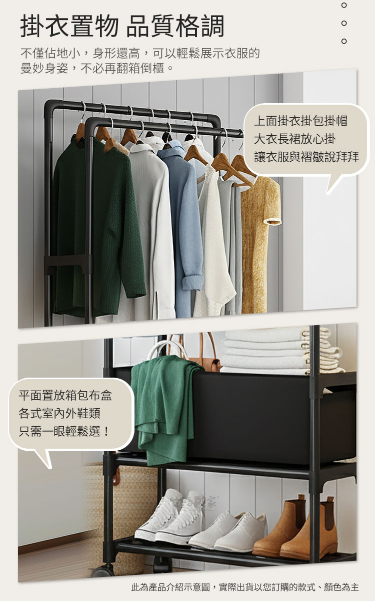 好友們!最近發現了一款鞋類收納好物「落地型雙排組合衣帽鞋架」!這款衣帽鞋架真的太實用了,不僅進門放鞋子超方便,就連外套、帽子也都沒問題,門口整齊到連財神爺都捨不得離開!🏠✨首先「組合式結構」,無論是安裝還是拆卸都非常方便,隨時隨地都能輕鬆搬運。對於有搬家需求或愛變換家居佈局的人來說,這款架子真是太實用了!🔧🛠️「分層分類收納」回到家順手將衣服外套、帽子、鞋子、包包等各種物品整齊收在同一個地方,不再亂成一團。「多功能一體」,靈活使用,在同一個架子上就能搞定所有收納需求!👕👒👟最貼心的是,它還配有「滑輪」,日常移動或地板清潔,分分鐘手到擒來。「加粗鋼管」設計,承重力佳,掛放再多的衣服或鞋子都完全沒問題。💪🧥「潮流設計美學風格」它不僅實用,還是家中的一大亮點。「高效利用空間」,無論是放在臥室、玄關還是衣帽間,都能讓家裡變得更加整潔有序。「化繁為簡,收納一次到位」,生活變得更加方便、舒適!🌟🏡衣帽鞋架真的是我的福星,進門後心情一整個舒服,門口就是整齊、乾淨、清爽,趕來入手吧!🏠💖#衣帽鞋架 #家居收納 #組合式結構 #分層收納 #防塵布套 #潮流設計 #利用空間 #居家美學注意事項:1.請勿重摔或高處掉落,以免商品受損。2.請勿接近高溫或勿近火源處,以免商品受損。3.商品情境圖片僅供參考,實際出貨不含週邊道具及配件。
