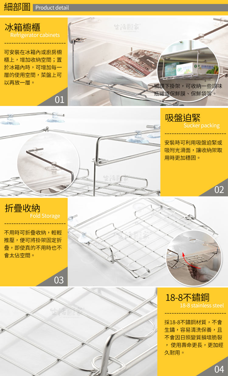 收納空間大躍進,增加冰箱及櫥櫃空間!!◆可安裝在冰箱內或廚房櫥櫃上,增加收納空間。◆置於冰箱內時,可增加每一層的使用空間,菜盤上可以再放一層。◆置於櫥櫃上可變成下掛架,可收納一些調味瓶罐或保鮮膜、保鮮袋等。◆不用時可折疊收納,輕輕推壓,便可將掛架固定折疊,不用時也不會佔空間。◆採18-8不鏽鋼材質,不會生鏽,容易清洗保養,經久耐用。◆不鏽鋼材不電鍍,直採採用不鏽鋼本色,長保如新,衛生可靠。◆全品採不鏽鋼材質製造,不似塑膠材質易斷裂,耐用好清洗,不易藏污垢。◆這麼實用、便利的商品,親愛的朋友們...您絕對不能錯過的收納工具。