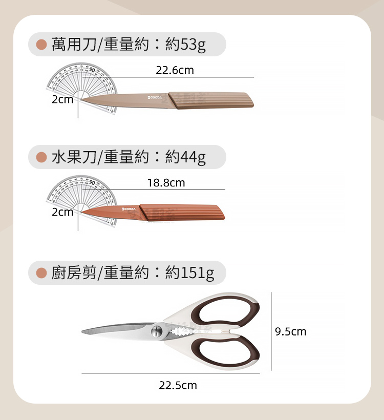 商品規格:1.尺寸: 廚師刀-30.7cm、麵包刀-31.6cm、切片刀-31.6cm、日式刀-28.3cm、萬用刀-22.6cm、水果刀-18.8cm、廚房剪-22.5cm2.材質:刀刃-3Cr13不鏽鋼、刀柄-PP、TPR3.重量:廚師刀-約143g、麵包刀-約126g、切片刀-約118g、日式刀-約140g、萬用刀-約53g、水果刀-約44g、廚房剪-約151g4.產地:中國5.適用:肉類、海鮮、麵包、甜點、蔬果等切削使用※商品為人工丈量略有誤差,請以實品為準。※網頁圖片因拍攝關係或螢幕設定不同而會與實際商品略有色差,請以實際收到商品為準。