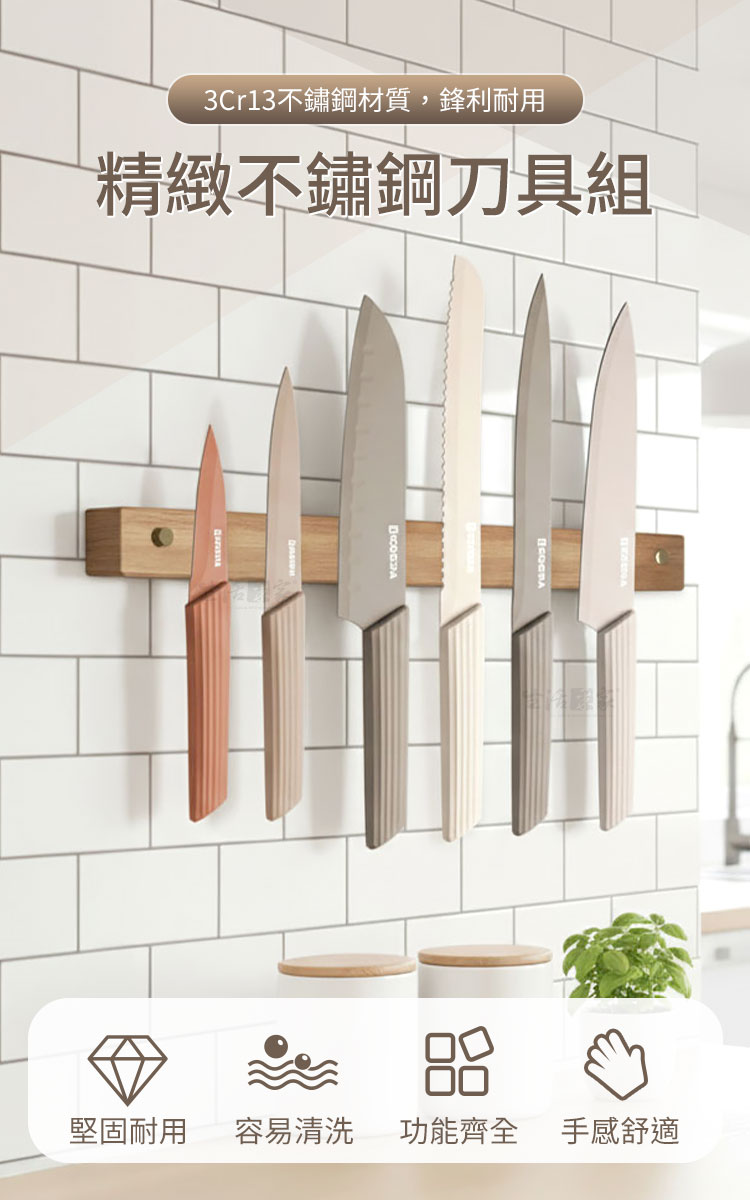 生活采家 13件組精緻不鏽鋼刀具組|讓料理變得更俐落在廚房中,一把好刀,是你料理靈感的開端。✨這款【生活采家 13件組不鏽鋼刀具組】,採用 3Cr13高碳不鏽鋼材質,刀刃鋒利耐磨、不易生鏽,結合防沾塗層處理,切割更順暢、不沾食材,讓備料變得更輕鬆。👉 專業配置,一組搞定所有料理任務🍅 多功能刀型設計:廚師刀、切片刀、麵包刀、水果刀、日式刀、剪刀一應俱全。🍞 防滑握柄:刀柄防滑紋理提升切削穩定度,即使手濕也好握不滑。🍖 不鏽鋼刀面+不沾塗層:防鏽耐用、易清洗,切肉、切菜、切麵包都順手。🌈 簡約時尚外型:中性色調搭配流線設計,完美融入各種廚房風格。🧼 好清好收納:用後一沖即淨,乾淨不留異味,刀套保護安全又方便。👉 使用後你會發現~從備料到上菜,每一次切割都能感受到「俐落與順暢」。不論是切魚片、削水果、分肉塊、還是切吐司,都能保持完美刀感。刀身輕盈卻穩重,握感舒適,即使長時間使用也不費力。對於喜歡烹飪、講究生活質感的你,這組刀具是廚房的必備良伴。👉 想讓料理更有效率、更有儀式感?現在入手「生活采家 13件組刀具組」,一次擁有多款功能刀型,從切肉、切菜到烘焙一應俱全。不僅實用,更是送禮體面首選。🎁🔜 立即加入購物車,開啟你的俐落料理時光吧!#廚房刀具推薦 #不鏽鋼刀組 #料理好物 #生活采家 #料理美學📣 FAQ (常見問答)Q1:刀具是全不鏽鋼嗎?會生鏽嗎?A:採用3Cr13高碳不鏽鋼材質,防鏽耐蝕性佳,正常使用與清潔可長久保持光亮。Q2:刀具可放洗碗機清洗嗎?A:建議手洗並擦乾,以延長刀刃壽命與保持握柄完整。Q3:這組刀具適合新手使用嗎?A:非常適合!各種刀型設計完善,輕量好握,新手也能輕鬆上手。Q4:刀具有防滑設計嗎?A:有,刀柄採防滑紋路與人體工學設計,即使濕手操作也穩定安全。Q5:刀具是否附收納座?A:沒有哦,每把刀具僅附刀套(剪刀除外),沒有附刀具收納座哦。注意事項:1.使用後請立即清洗並擦乾,避免水漬造成刀面斑點。2.請勿用於切骨或硬物,以免造成刀刃缺口。3.刀具請放置於孩童不易拿取之處。4.請勿長時間浸泡於水中或強酸強鹼清潔液中。5.若長期不使用,建議加少許食用油塗抹刀面防鏽保存。6.商品出貨不含砧板、食材及週邊道具。