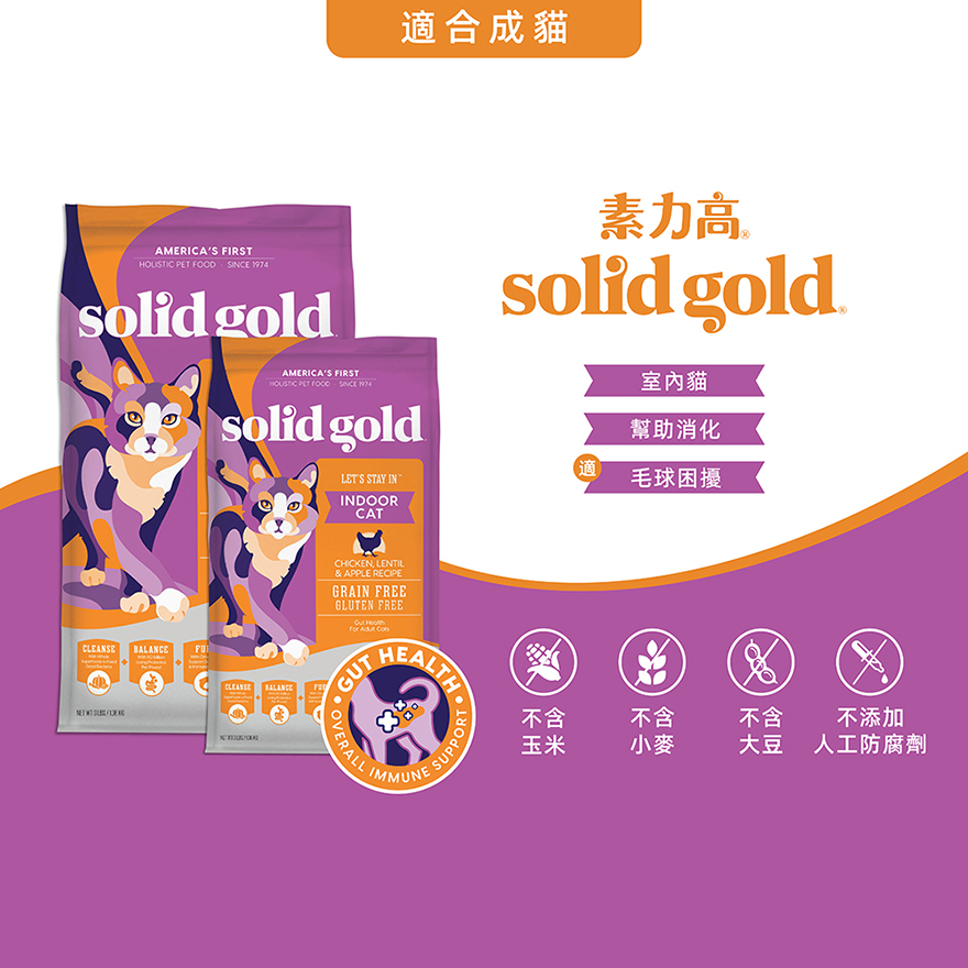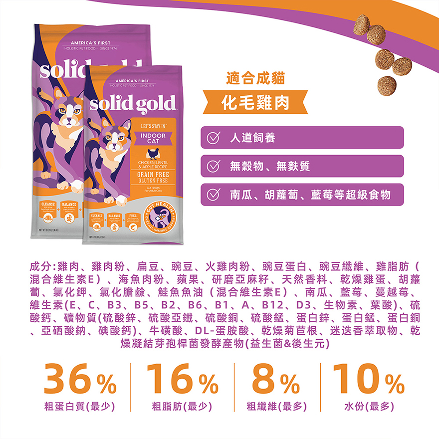 產品名稱:【Solid gold 素力高】無穀貓糧口味:化毛雞肉規格:5.44kg產 地:美國