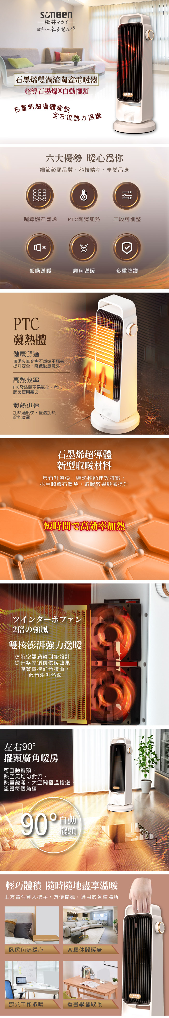 品 牌:SONGEN松井型 號:SG-2702PTC-W 晨曦白額定電壓及額定頻率:110V / 60Hz總額定消耗電功率:1200W產品尺寸(寬x深x高):185x185x485mm商品重量:2.14KG材 質:PTC陶瓷發熱體產品保證:明台產物保險2000萬產品責任險製造沿革:45年電器專業製造,保證售後服務
