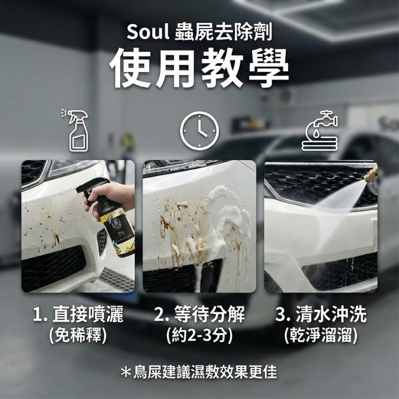 4. 及時處理:鳥屎與蟲屍多為酸性,長時間停留會腐蝕金油層造成永久斑痕,發現後請盡快使用本劑清洗。