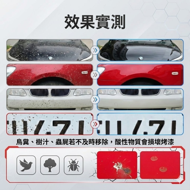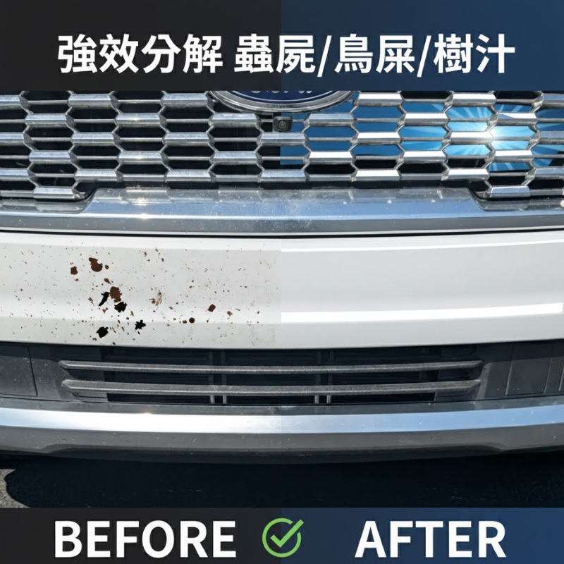 1. 強效分解髒污:專為去除車身難纏的酸性髒污設計,能快速軟化並分解乾硬的蚊蟲屍體、鳥禽類排泄物及黏膩樹汁,避免更用力刷洗造成刮傷。