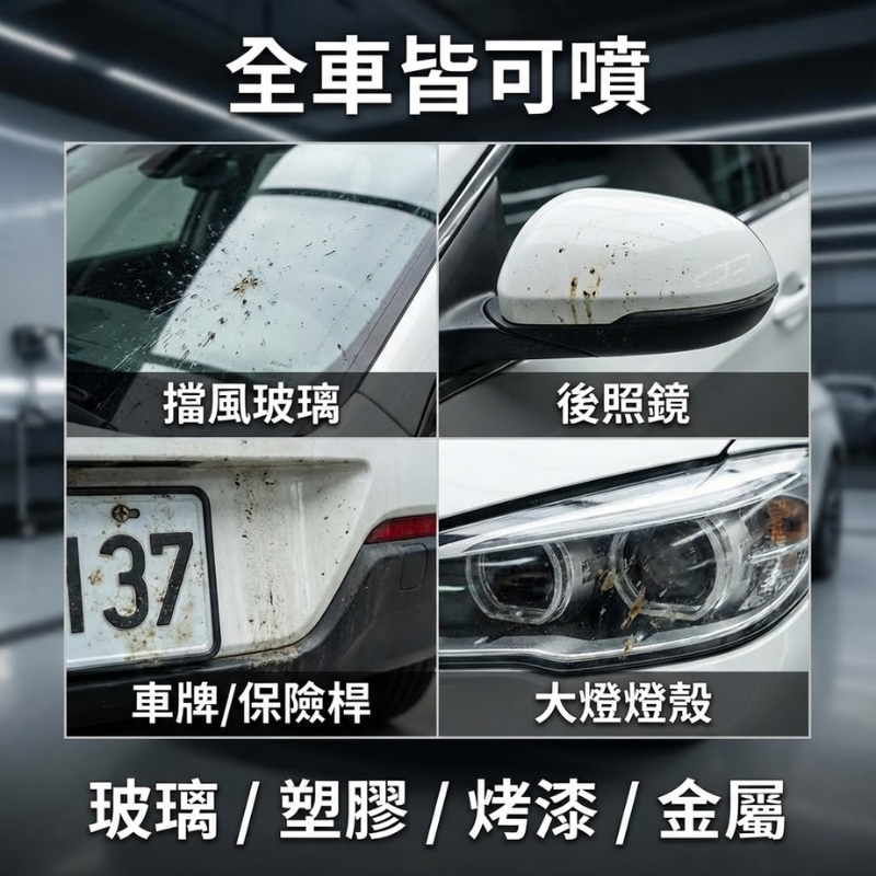 2.將藥劑噴灑於板金、玻璃、後照鏡...等任何附著於車體上所有的蚊蟲屍體
