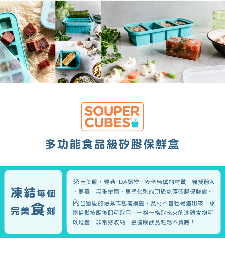多功能食品級矽膠保鮮盒讓冷凍個人份量的湯品、嬰兒副食品、 醬料、 果汁等液 體變得更輕鬆簡單!採用100% FDA食品級頂級厚矽膠和鋼製邊緣製成,使盒身更加堅固避免溢出,好蓋又好裝。具有專利以及獨家設計的托盤可製作3.2x10.8x4.9公分大小的冰磚。每一格內都顯示刻度可清楚測量裝入的容量。不含BPA的上蓋可緊密貼合,以防止溢出、避免盒內食物沾染其他異味,並易於堆疊及收納。不含雙酚A可安心使用。 可進洗碗機清洗。本體可進烤箱,安全溫度至212度(上蓋請勿放入)