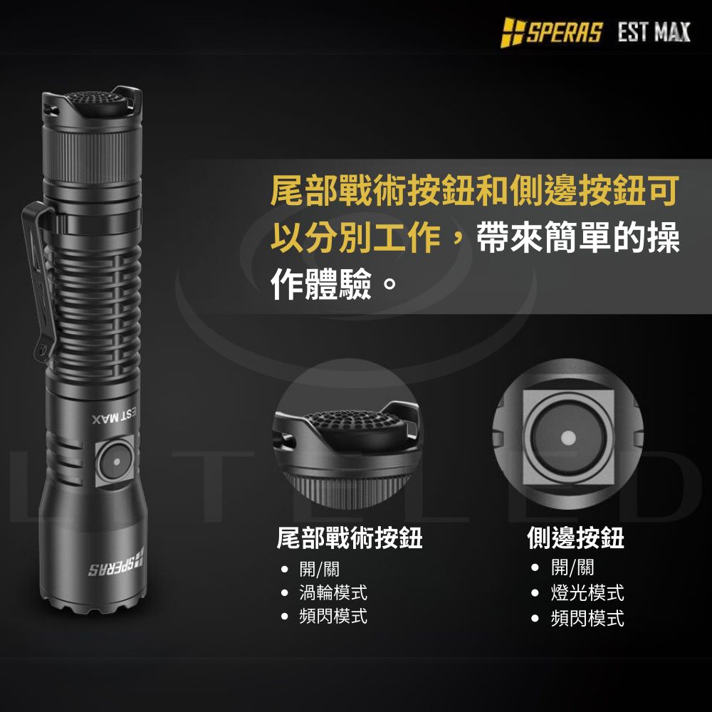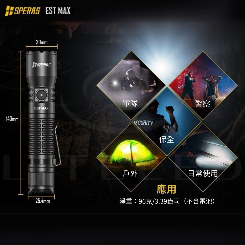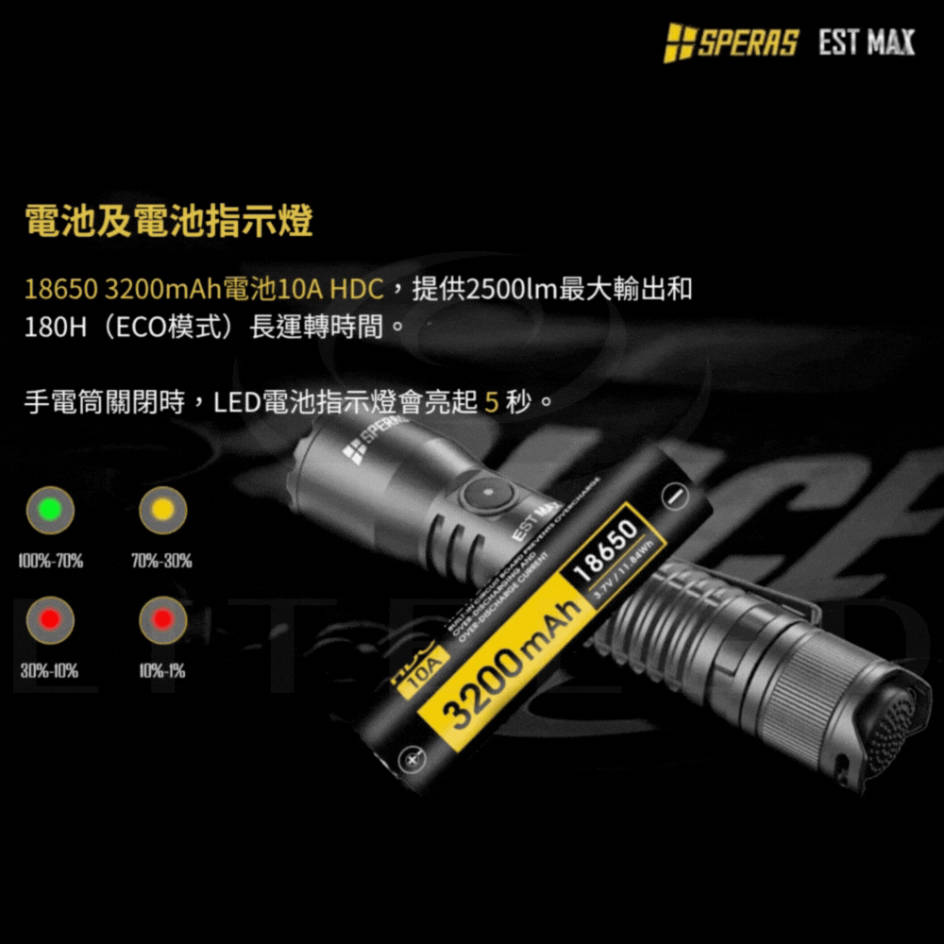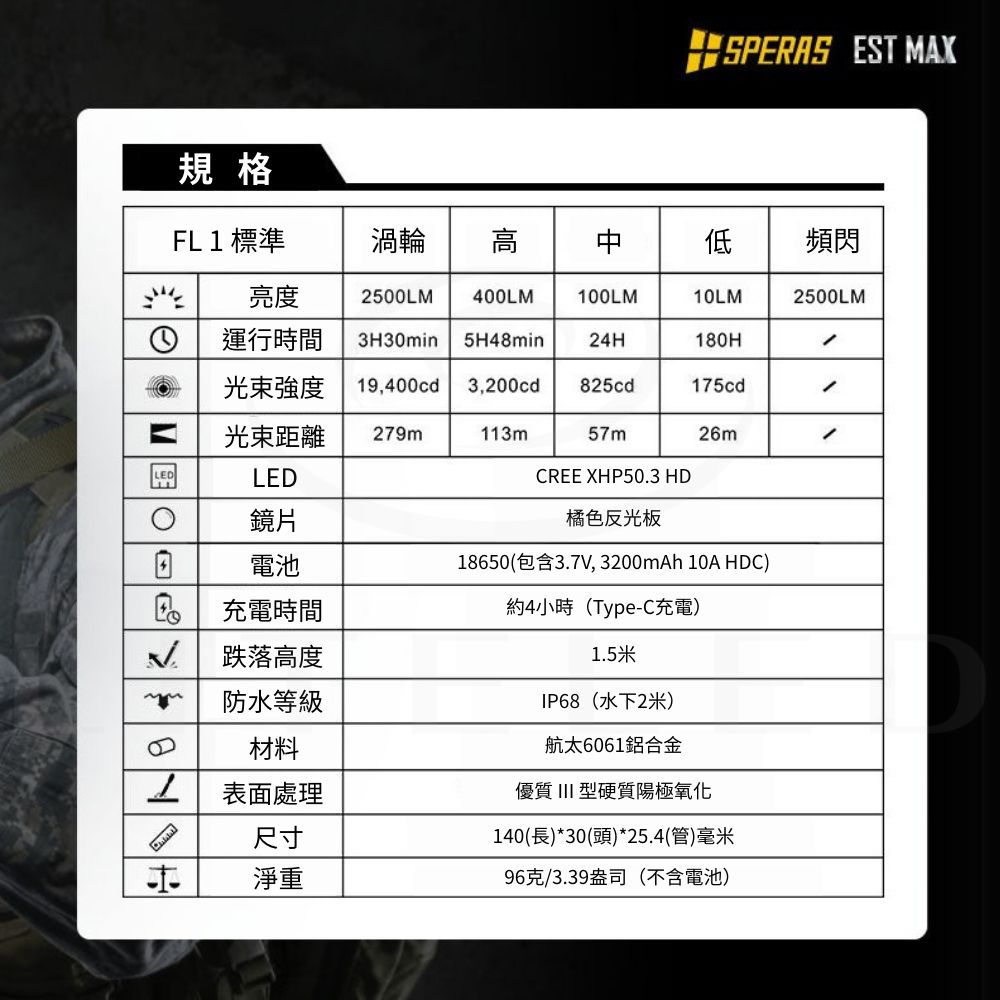 ● 最大輸出:2500流明● 最大光束距離:279米● 最大光強:19400cd● 最大運轉時間:低模式下180小時● 使用電池:專用18650電池● 產品尺寸:140(長)*30(高)*25.4(厚) mm● 產品重量:96g(不含電池)● 防護等級:IP68(水下2米),1.5米抗衝擊